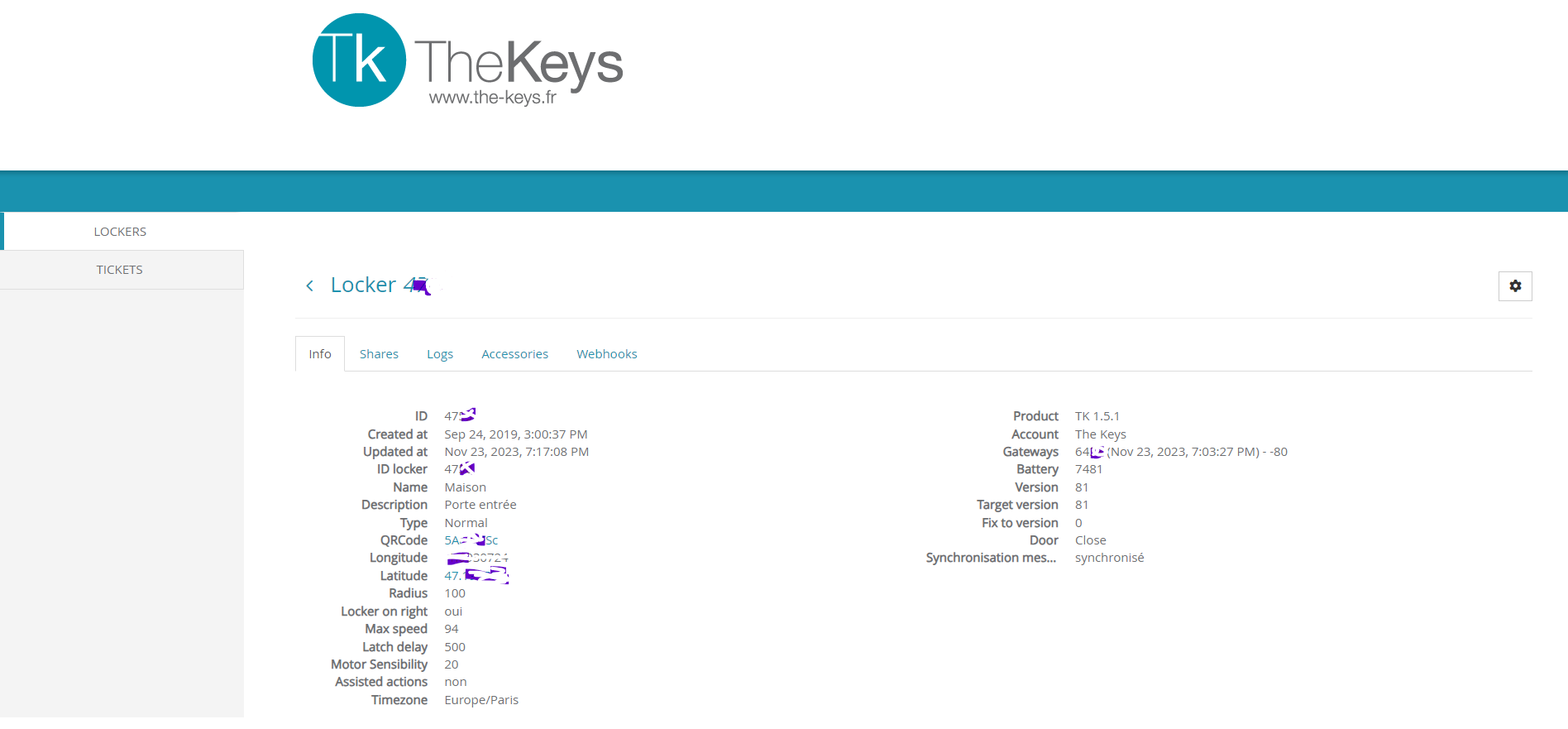 2223|[2023-11-23 04:00:35]DEBUG : Retour : {« status »:200,« data »:{« id »:16575,« type »:« user_utilisateur »,« roles »:[« ROLE_UTILISATEUR »],« firstname »:« Philippe »,« lastname »:« Le Bonhomme",« locale »:« fr »,« username »:« +33xxxxxxxxx »,« email »:"plexxxxx@gmail.com »,« created_at »:{« date »:« 2019-10-01 09:43:36.000000 »,« timezone_type »:3,« timezone »:« Europe/Berlin »},« updated_at »:{« date »:« 2021-06-09 14:45:09.000000 »,« timezone_type »:3,« timezone »:« Europe/Berlin »},« notification_token »:« fMRn-2mWry8:APA91bFwxxxxxxxxxxxxx-1_KcwdM1-Klxxx-iJHWsGfPe4jIkW8fOqbaFIpuS8au7_5rpL6StpKOMxxxxxxxxxxxxxxxxxxxxxxxxxxxxxxxxxOV-Om96p2Y4N »,« notification_enabled »:true,« serrures »:[{« id »:47xx,« id_serrure »:« 47xx »,« code »:« a19b4xxxxxxxx9 »,« code_serrure »:« 1fc2xxxxxxxxxxxxxxxxxxf269617 »,« etat »:« close »,« nom »:« Maison »,« couleur »:null,« qrcode »:« 5AaZzFSc »,« serrure_droite »:true,« main_libre »:true,« longitude »:-1.6xxxx4,« latitude »:47.xxxxx,« radius »:100,« timezone »:« Europe/Paris »,« maxSpeed »:94,« latchDelay »:500,« assistedActions »:false,« unlockOnly »:true,« description »:« Porte entr\u00e9e »,« logSequence »:0,« public_key »:« AEaxWWN644hYNKlRBCR2qsgdCh6moxxxxxxxxxxxxxxxxxxxxxxxxxxxxxxxxxxxxxxxFjBNntxQu0Q== »,« message »:« »,« utilisateur »:{« username »:« +33637743158 »,« firstname »:« Philippe »,« lastname »:« Le Bxxxxxxx »},« version »:81,« version_cible »:81,« beta »:0,« battery »:7515,« battery_date »:{« date »:« 2023-11-22 22:27:28.000000 »,« timezone_type »:3,« timezone »:« Europe/Berlin »},« accessoires »:[{« id »:43xx,« accessoire »:{« id »:61xx,« id_accessoire »:« 0cxxxxnWD »,« nom »:« Door sensor »,« type »:7,« configuration »:[]},« info »:null},{« id »:43xx,« accessoire »:{« id »:58xx,« id_accessoire »:« GXxxxxMD »,« nom »:« Digicode TK »,« type »:2,« configuration »:[]},« info »:null},{« id »:4330,« accessoire »:{« id »:64xx,« id_accessoire »:« Kaxxd0J »,« nom »:« TK Gateway »,« type »:1,« configuration »:[]},« info »:null}],« produit »:{« id »:12,« nom »:« TK 1.5.1 »,« version »:81,« versionBeta »:82}}],« tel »:« +33637743158 »},« message »:{« global »:[],« form »:[]}}
