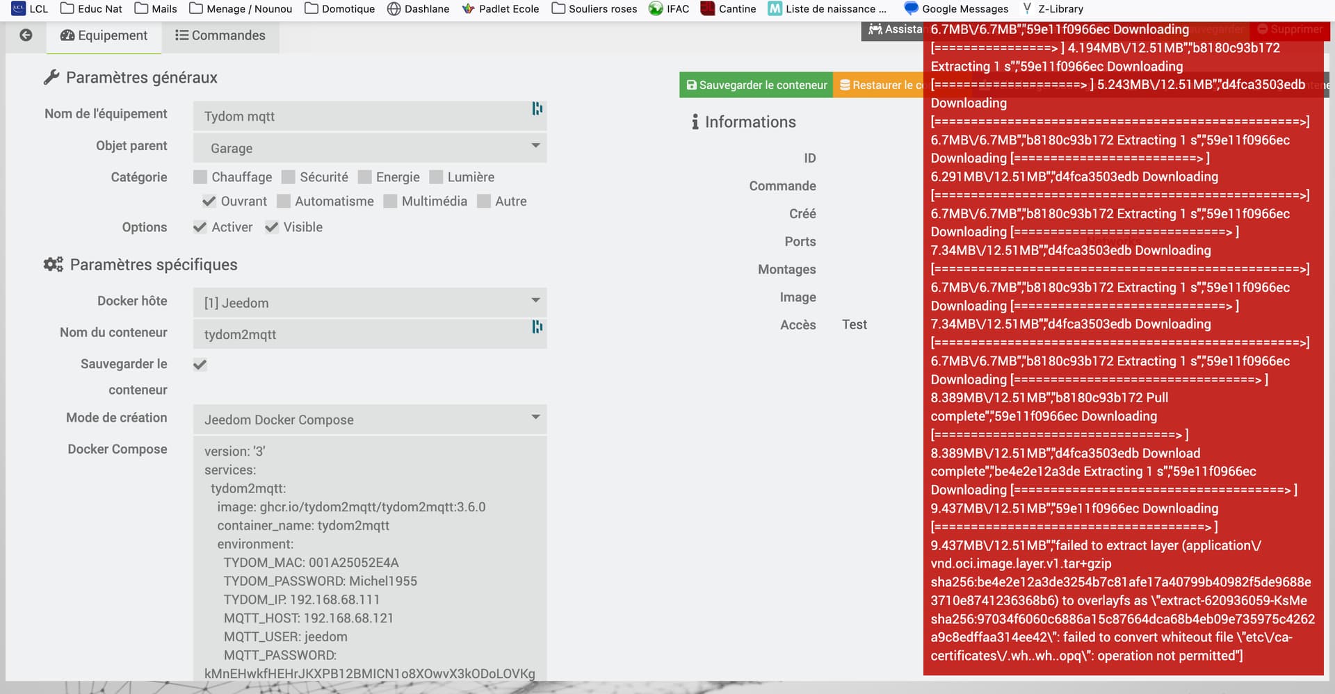 Erreur exécution de la commande [Garage][Tydom mqtt][Recréer] : Erreur d'exécution de la commande : sudo docker-compose -f /tmp/288ac8c12bcc92d0bed4.yml up -d --force-recreate 2>&1 (18) => ["tydom2mqtt Pulling","302fe217d622 Pulling fs layer","a18bdd14b476 Pulling fs layer","89716e709abe Pulling fs layer","b8180c93b172 Pulling fs layer","aab79de483de Pulling fs layer","be4e2e12a3de Pulling fs layer","9a46c7964c3b Pulling fs layer","59e11f0966ec Pulling fs layer","cfa6870bbb20 Downloading [==================================================>] 10.36kB\/10.36kB","cfa6870bbb20 Downloading [==================================================>] 10.36kB\/10.36kB","a18bdd14b476 Downloading [==================================================>] 243B\/243B","9a46c7964c3b Download complete","cfa6870bbb20 Download complete","a18bdd14b476 Download complete","aab79de483de Download complete","89716e709abe Downloading [===========> ] 696.3kB\/3.11MB","be4e2e12a3de Downloading [==================================================>] 624.4kB\/624.4kB","302fe217d622 Downloading [=======> ] 1.049MB\/6.801MB","89716e709abe Downloading [================> ] 1.049MB\/3.11MB","be4e2e12a3de Download complete","302fe217d622 Downloading [=======> ] 1.049MB\/6.801MB","89716e709abe Downloading [================> ] 1.049MB\/3.11MB","59e11f0966ec Downloading [====> ] 1.049MB\/12.51MB","b8180c93b172 Downloading [============> ] 819.2kB\/3.258MB","302fe217d622 Downloading [=======> ] 1.049MB\/6.801MB","89716e709abe Downloading [================> ] 1.049MB\/3.11MB","59e11f0966ec Downloading [====> ] 1.049MB\/12.51MB","302fe217d622 Downloading [=======> ] 1.049MB\/6.801MB","89716e709abe Downloading [================> ] 1.049MB\/3.11MB","59e11f0966ec Downloading [====> ] 1.049MB\/12.51MB","b8180c93b172 Downloading [================> ] 1.049MB\/3.258MB","b8180c93b172 Downloading [================> ] 1.049MB\/3.258MB","302fe217d622 Downloading [=======> ] 1.049MB\/6.801MB","89716e709abe Downloading [================> ] 1.049MB\/3.11MB","59e11f0966ec Downloading [====> ] 1.049MB\/12.51MB","302fe217d622 Downloading [=======> ] 1.049MB\/6.801MB","89716e709abe Downloading [================> ] 1.049MB\/3.11MB","59e11f0966ec Downloading [====> ] 1.049MB\/12.51MB","b8180c93b172 Downloading [================> ] 1.049MB\/3.258MB","b8180c93b172 Downloading [================> ] 1.049MB\/3.258MB","302fe217d622 Downloading [===============> ] 2.097MB\/6.801MB","89716e709abe Downloading [================> ] 1.049MB\/3.11MB","59e11f0966ec Downloading [========> ] 2.097MB\/12.51MB","b8180c93b172 Downloading [================================> ] 2.097MB\/3.258MB","302fe217d622 Downloading [===============> ] 2.097MB\/6.801MB","89716e709abe Downloading [================> ] 1.049MB\/3.11MB","59e11f0966ec Downloading [========> ] 2.097MB\/12.51MB","302fe217d622 Downloading [===============> ] 2.097MB\/6.801MB","89716e709abe Downloading [=================================> ] 2.097MB\/3.11MB","59e11f0966ec Downloading [========> ] 2.097MB\/12.51MB","b8180c93b172 Downloading [================================> ] 2.097MB\/3.258MB","89716e709abe Downloading [=================================> ] 2.097MB\/3.11MB","59e11f0966ec Downloading [========> ] 2.097MB\/12.51MB","b8180c93b172 Downloading [================================> ] 2.097MB\/3.258MB","302fe217d622 Downloading [===============> ] 2.097MB\/6.801MB","302fe217d622 Downloading [===============> ] 2.097MB\/6.801MB","89716e709abe Downloading [=================================> ] 2.097MB\/3.11MB","59e11f0966ec Downloading [============> ] 3.146MB\/12.51MB","b8180c93b172 Downloading [================================> ] 2.097MB\/3.258MB","b8180c93b172 Downloading [==================================================>] 3.258MB\/3.258MB","302fe217d622 Downloading [===============> ] 2.097MB\/6.801MB","89716e709abe Downloading [=================================> ] 2.097MB\/3.11MB","59e11f0966ec Downloading [============> ] 3.146MB\/12.51MB","302fe217d622 Downloading [=======================> ] 3.146MB\/6.801MB","89716e709abe Downloading [=================================> ] 2.097MB\/3.11MB","59e11f0966ec Downloading [============> ] 3.146MB\/12.51MB","b8180c93b172 Downloading [==================================================>] 3.258MB\/3.258MB","b8180c93b172 Downloading [==================================================>] 3.258MB\/3.258MB","302fe217d622 Downloading [=======================> ] 3.146MB\/6.801MB","89716e709abe Downloading [=================================> ] 2.097MB\/3.11MB","59e11f0966ec Downloading [================> ] 4.194MB\/12.51MB","302fe217d622 Downloading [=======================> ] 3.146MB\/6.801MB","89716e709abe Downloading [=================================> ] 2.097MB\/3.11MB","59e11f0966ec Downloading [================> ] 4.194MB\/12.51MB","b8180c93b172 Downloading [==================================================>] 3.258MB\/3.258MB","302fe217d622 Downloading [=======================> ] 3.146MB\/6.801MB","89716e709abe Downloading [==================================================>] 3.11MB\/3.11MB","59e11f0966ec Downloading [================> ] 4.194MB\/12.51MB","b8180c93b172 Download complete","b8180c93b172 Extracting 1 s","302fe217d622 Downloading [==============================> ] 4.194MB\/6.801MB","89716e709abe Downloading [==================================================>] 3.11MB\/3.11MB","59e11f0966ec Downloading [====================> ] 5.243MB\/12.51MB","b8180c93b172 Extracting 1 s","302fe217d622 Downloading [==============================> ] 4.194MB\/6.801MB","89716e709abe Downloading [==================================================>] 3.11MB\/3.11MB","59e11f0966ec Downloading [====================> ] 5.243MB\/12.51MB","b8180c93b172 Extracting 1 s","302fe217d622 Downloading [==============================> ] 4.194MB\/6.801MB","89716e709abe Download complete","59e11f0966ec Downloading [=========================> ] 6.291MB\/12.51MB","b8180c93b172 Extracting 1 s","3