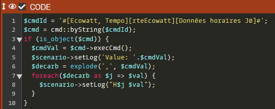 J’aimerai pouvoir utiliser ce résultat pour déclencher des automatismes pendant une période décarbonée et l’arrêter quand la production n’est plus décarbonée. Mais je sèche sur les fonctions jeedom que je peux utiliser dans un scénario pour faire cela.