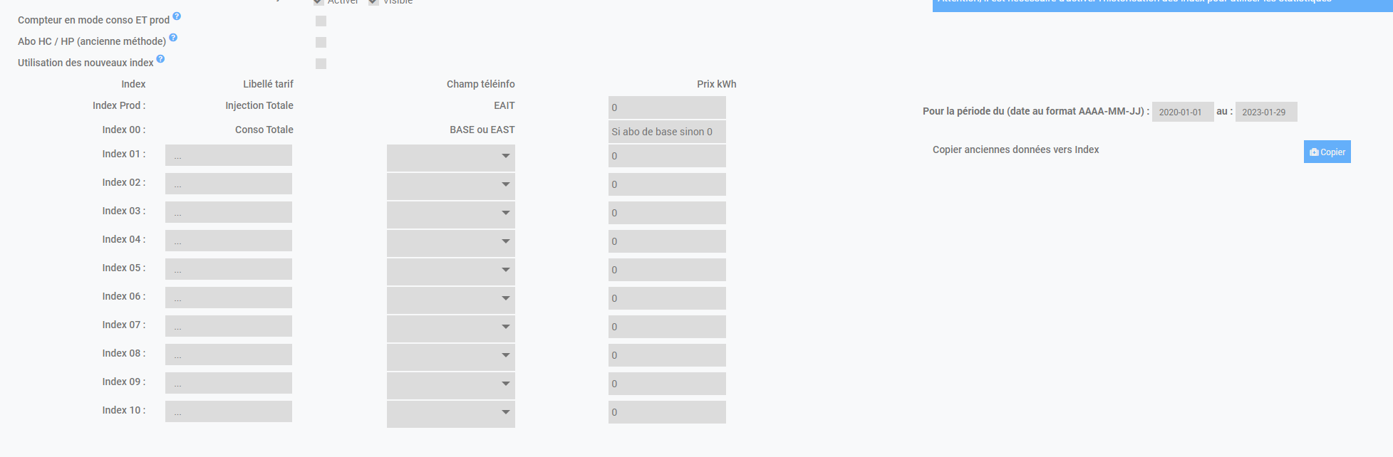 ok, alors dans la colonne « prix kwh » en face de « index00 » mets y un chiffre, normalement en ce moment en base c’est 0.17€ du kWh je crois. Puis relance la copie sur le temps que tu souhaites