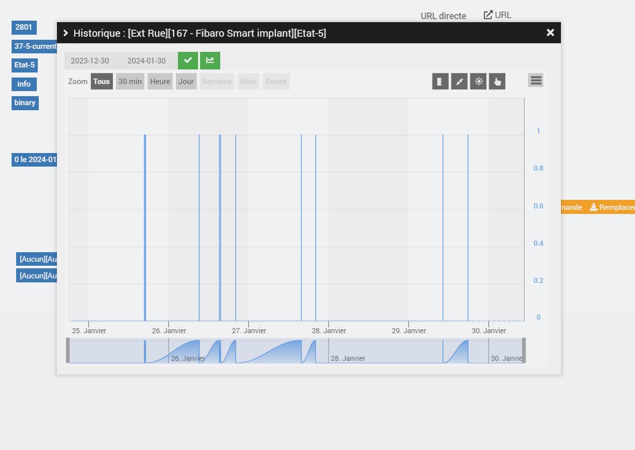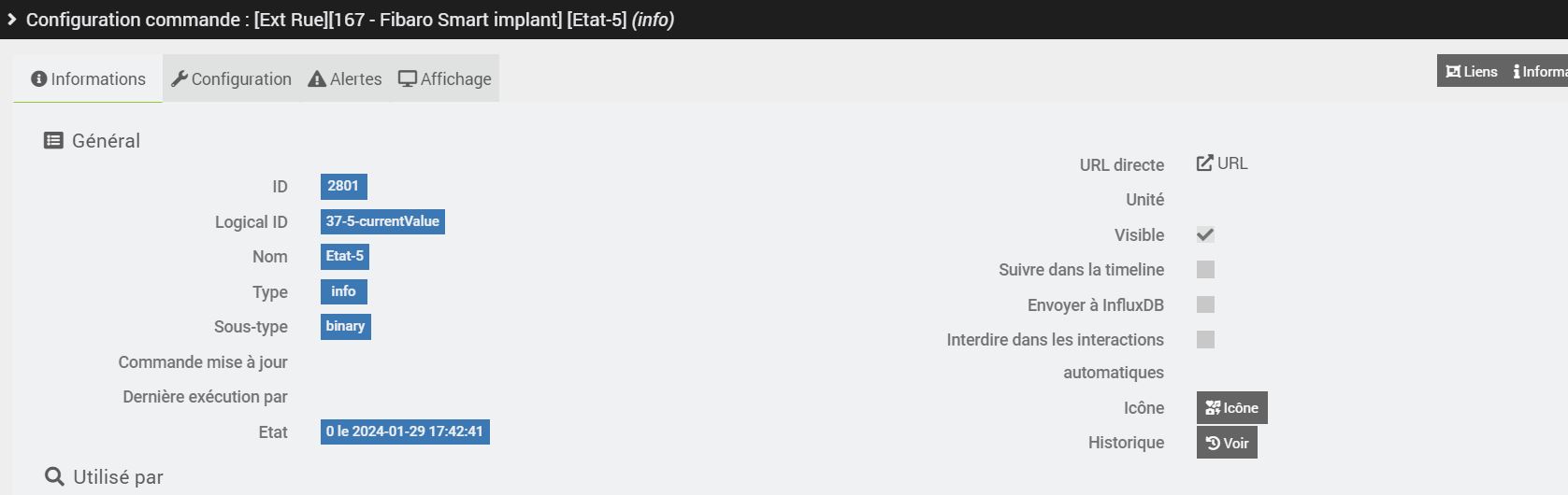 Sur d’autres équipements quand je passe la souris sur le nom de la commande (par exemple sur Etat du 160 Lampe…) je vois apparaitre « date de valeur » et « date de collecte » et si je clique sur cet Etat, je vois son historique, ce qui n’est pas le cas sur Etat-5 de 167 Fibaro et c’est la même chose sur Etat d’Alarm portail-164