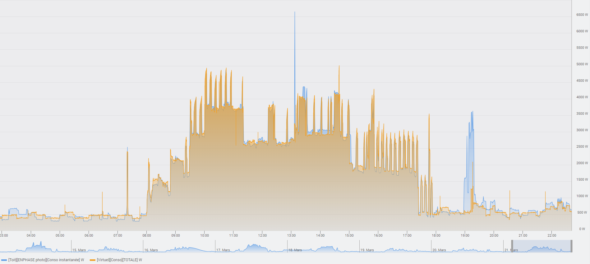 Je suis la conso de ma maison de mieux en mieux depuis quelques semaines en ayant ajouté des pinces dans mon tableau elec. Ainsi, si je compare la conso totale de ma maison donnée par ma passerelle enphase avec la somme de toutes les conso individuelles j’arrive plutot bien à suivre le profil de conso: