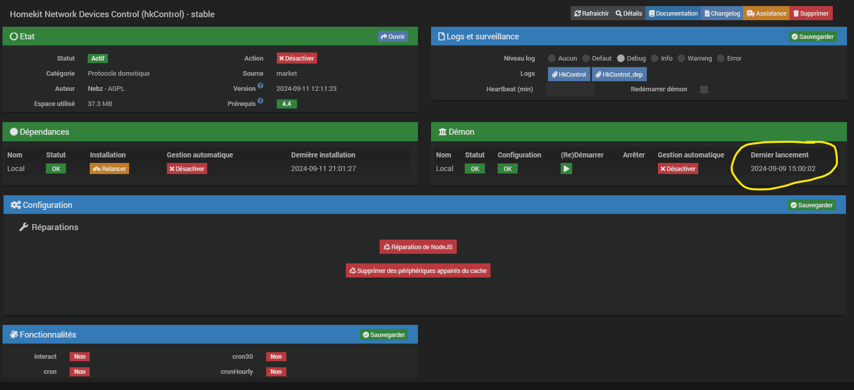 Je confirme. Les log hkcontrol_deamon ne bougent pas en mode debug et demon relancé et refresh des équipements.