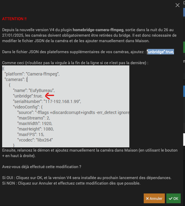 J’ai ajouté "unbridge":true, pour chaque caméras, j’ai relancé le démon et mes caméras ont bien disparu. Quand je clique sur le + de l’application iOS je ne sais pas ce qu’il faut faire. SI je clique sur Ajouter un accessoire, il n’y a pas les caméras, je peux scanner le QRCode qui me dis que le pont est déjà installé…