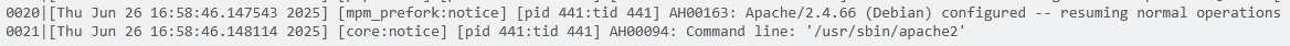 0002|[Thu Jun 26 02:44:57.673866 2025] [mpm_prefork:notice] [pid 420:tid 420] AH00163: Apache/2.4.66 (Debian) configured -- resuming normal operations