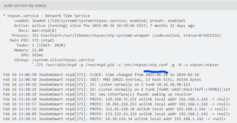Feb 16 13:20:22 JeedomSmart ntpd[1521]: Listen normally on 5 tun0 10.14.55.94:123