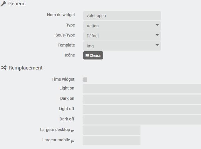 donc 3 widgets, à chaque fois choisir type/sous-type qui correspond à la commande et en dessous charger et utiliser l’image pour l’état « on » (ouvert) et « off » (fermé) pour le theme light & dark
