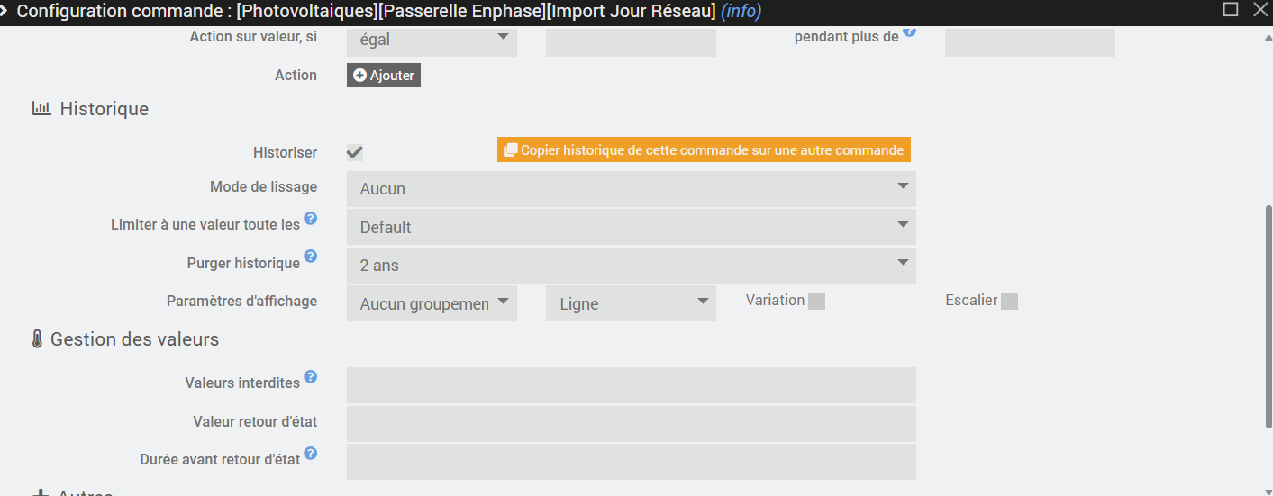 quelle configuration de l’historique puisque les valeurs que j’ai mises plus haut sont des valeurs de la base de données Jeedom que j’ai extrait à partir du plugin, donc pas de lissage. Je ne fais rien sur ces valeurs, j’imagine que c’est le plugin qui les rentre dans la BDD Jeedom.