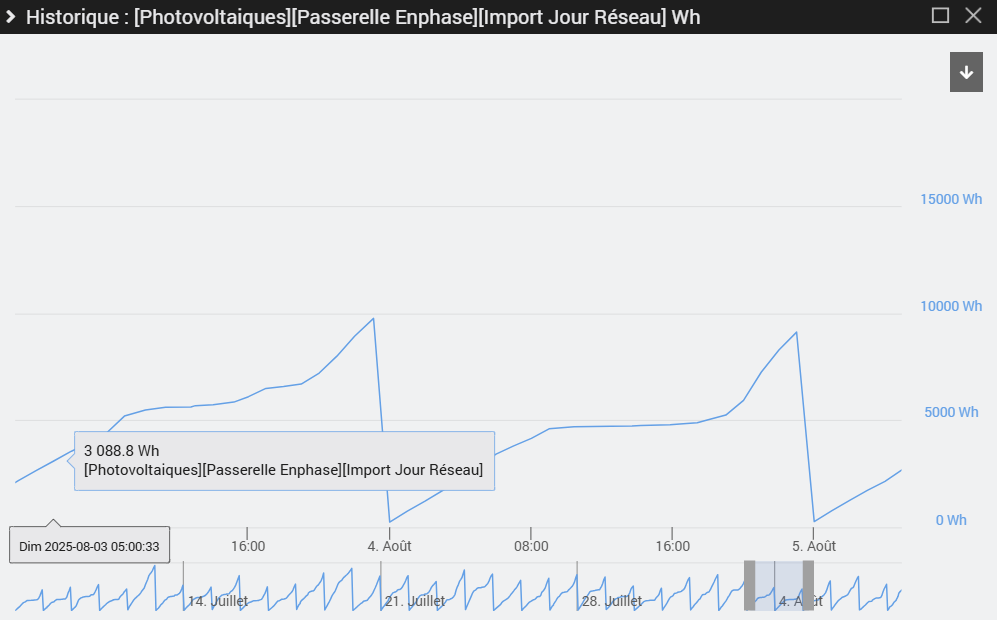 Ce que je ne comprends pas c’est que j’ai fait un scénario lancé à 23h59 où je mémorise la valeur de l’Import jour réseau du plugin dans une variable que j’affiche dans un virtuel et là ça fonctionne, je récupère pratiquement la même valeur qu’Enedis, c’est bizarre non ???