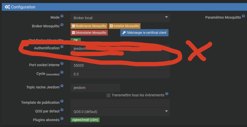 Pour le mot de passe, il faut utiliser celui-ci, présenté dans le plugin JeeZigbee, et non pas celui qui est dans le menu de configuration du plugin MQTT Manager (qui commence par « jeedom: ») :