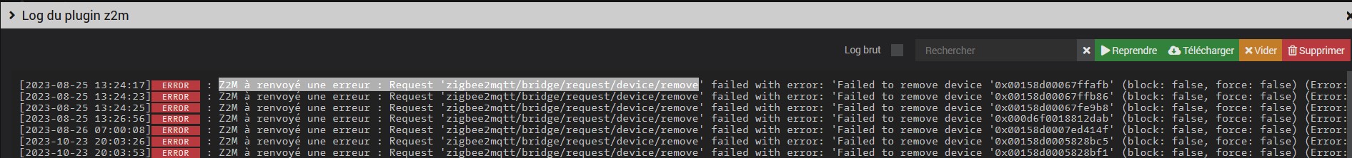 J’ai une version 4.3.19 de jeedom, je n’arrive pas à supprimer les appareils par l’intermédiaire de « Noeud » dans Jeezigbee; après des recherches sur le forum, il semblerait qu’il faille passer par Zigbee2MQTT sur le port 8080 pour les supprimer, lorsque j’ouvre ce dernier, la page est vierge et donc impossibilité de supprimer quoique ce soit, que faire ?