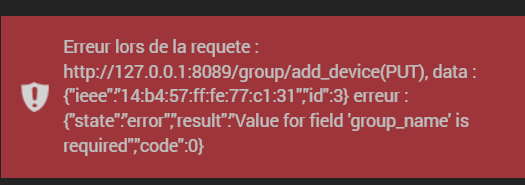 Erreur lors de la requete : http://127.0.0.1:8089/group/add_device(PUT), data : {« ieee »:« bc:33:ac:ff:fe:7a:6b:88 »,« id »:2} erreur : {« state »:« error »,« result »:« Value for field ‹ group_name › is required »,« code »:0}