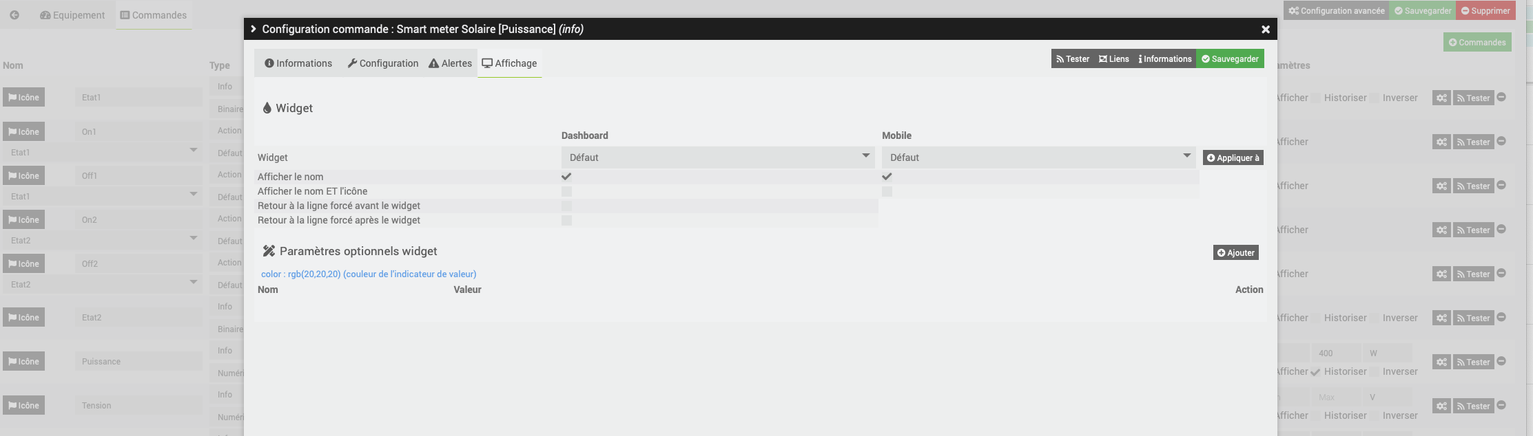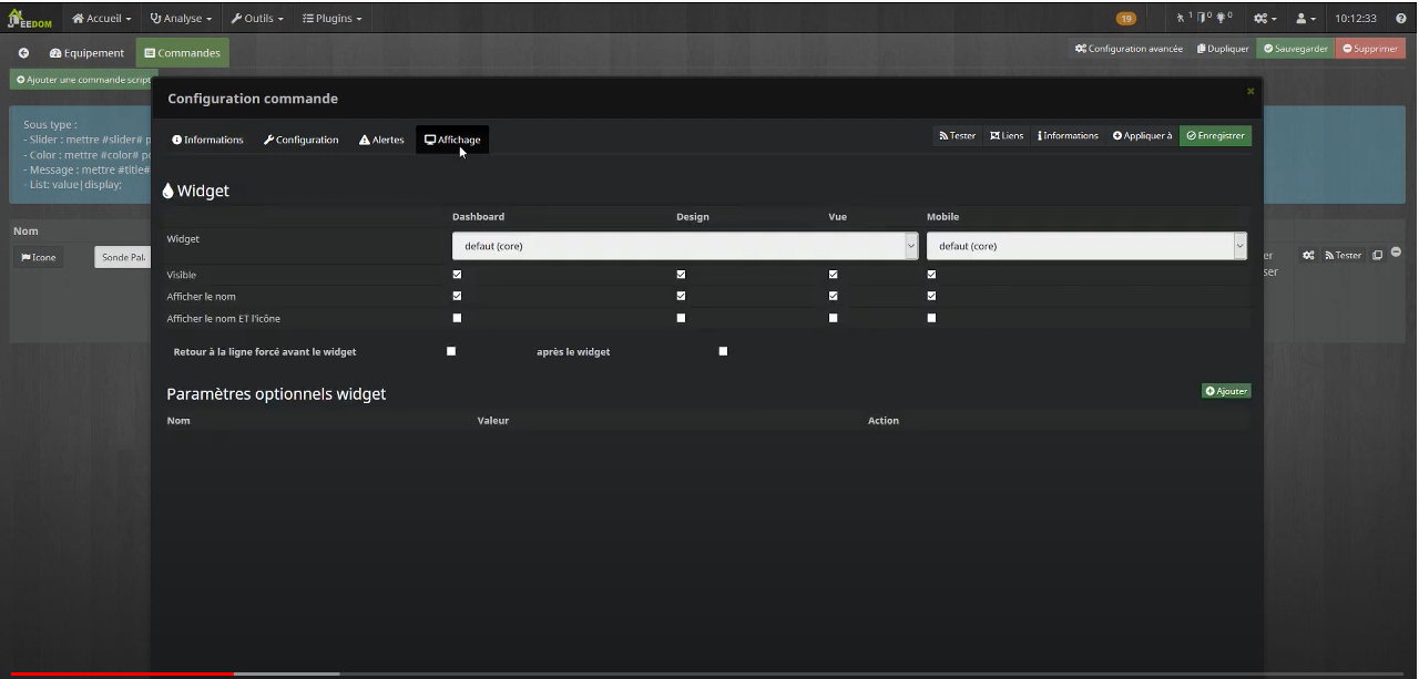 Dans l’interface des équipements, je n’ai pas les options pour changer le widget pour l’affichage dans une vue ou un design. Après avoir fait le tour de toutes les menus et options Jeedom (v4.2.20 avec tous les pleins a jour) je n’ai trouvé aucun moyen pour activer cela et toute piste sera la bienvenue.