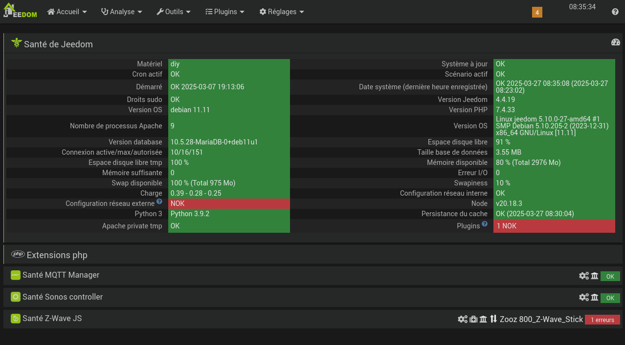 N’hésitez pas à me dire où je dois regarder et les infos que je peux vous transmettre pour aider à comprendre le problème, je débute vraiment sous Jeedom et j’ai vraiment besoin d’être guidé pour comprendre ce qui se passe (même si certaines choses vous semblent évidentes, pour l’instant je nage complétement !)