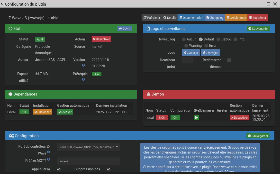 J’ai bien compris qu’il fallait MQTT pour faire fonctionner ZwaveJS. L’installation semble OK et le Démon de MQTT semble OK (cf capture)