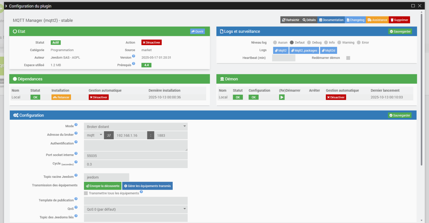 Sur un même Jeedom, le serveur MQTT doit être activé dans MQTT manager ou Zibeelinker, mais pas les 2 à la fois.
