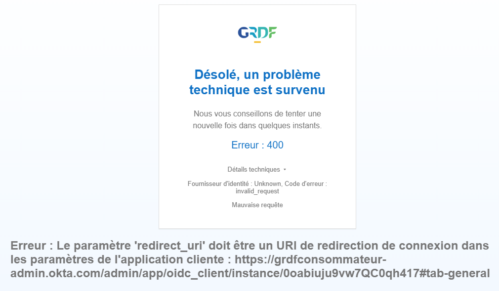Je suis le process pour la connexion, mais lorsque j’arrive sur la page de GRDF ça m’affiche " invalid_client Client authentication failed"