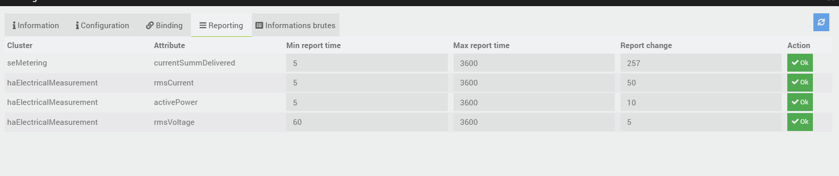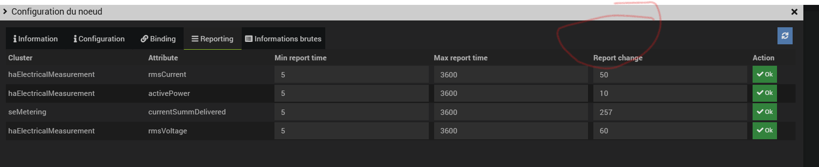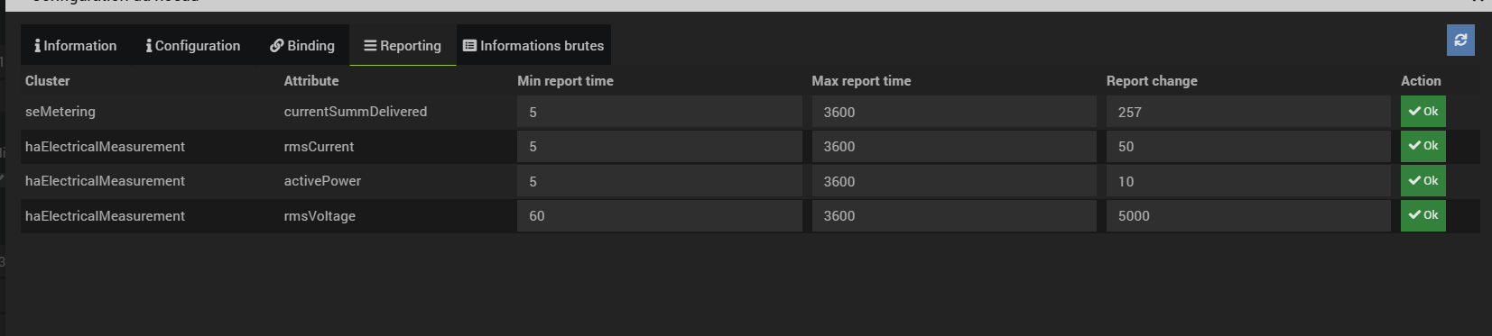 Dans jeezigbee, pour l’attribut rmsvoltage, je change le « min report time » de 5 à 60, puis je clique sur OK ; tout semble OK dans page Reporting de jeedom.