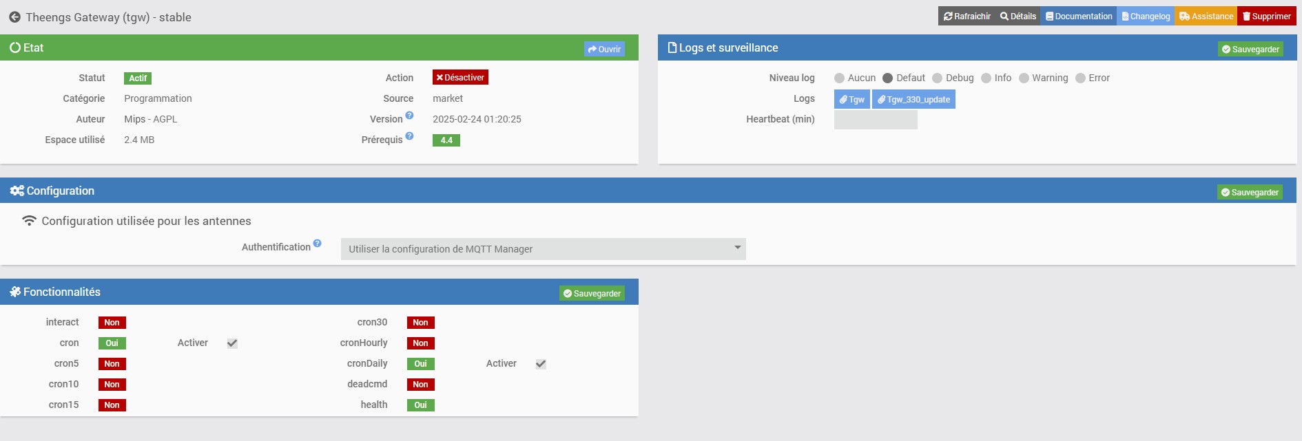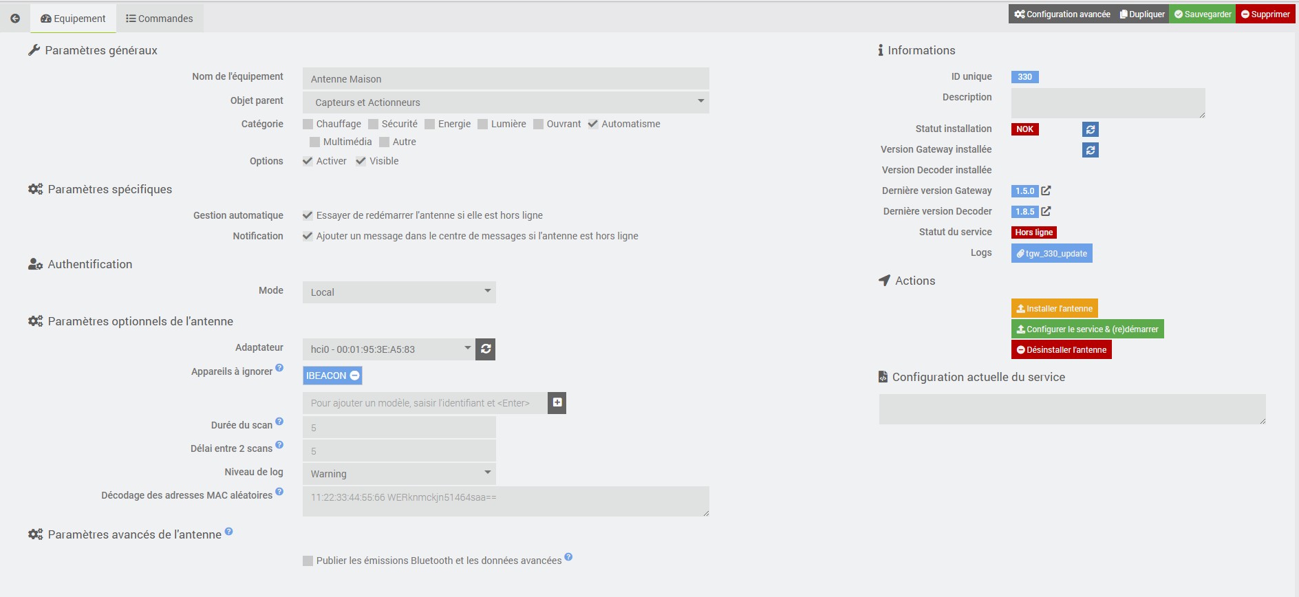 Donc en pièces attachées les copies d’écran des pages de config équipement et plugin.