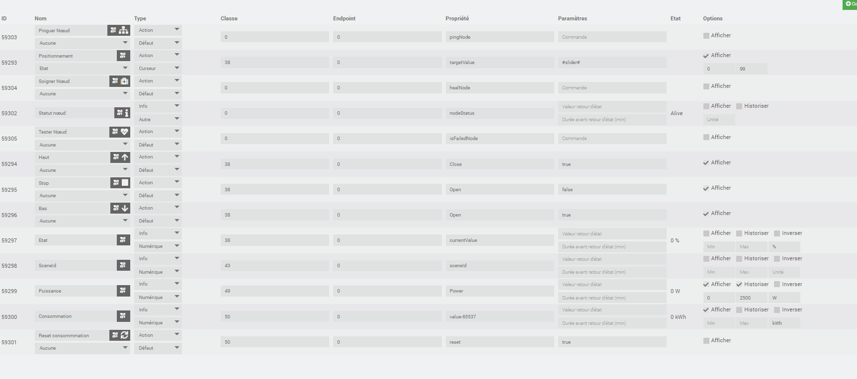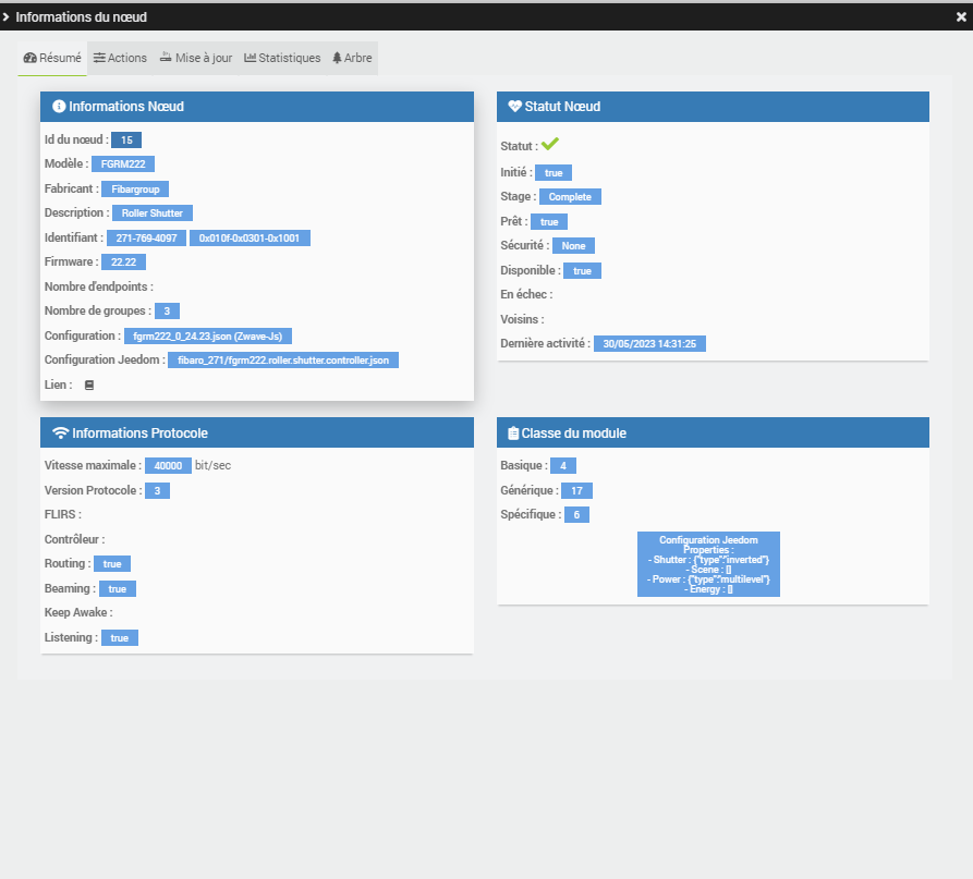 J’ai essayé de de soigner le noeud, de le ré interview, de le pinger. Les commandes haut\bas marchent bien mais c’est tout (pas de conso, de puissance ou d’état).