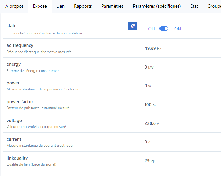 Par contre, chez moi, je ne peux pas changer l’état marche / arrêt (ce que je n’utilise pas), mais remonte bien la consommation et la puissance. Par contre, pas de tension, ni de courant. Peut-être sur de futures mises à jour…