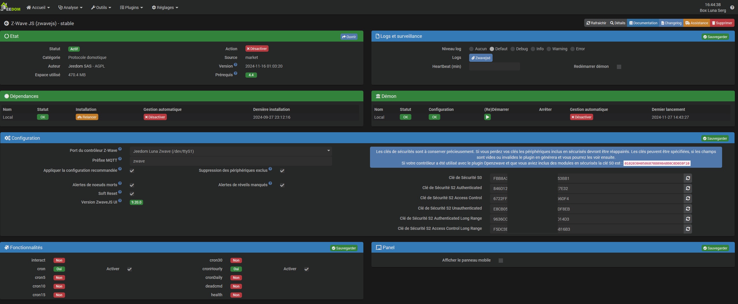 J’ai tenté de configurer le plugging avec la clef de sécurité S0 0102030405060708090A0B0C0D0E0F10 (puisque sur ma miniPlus, j’étais sous plugging openzwave) et de retenter l’exclusion puis l’inclusion, en mode défaut, sécurisé, non sécurisé … rien n’a fonctionné.