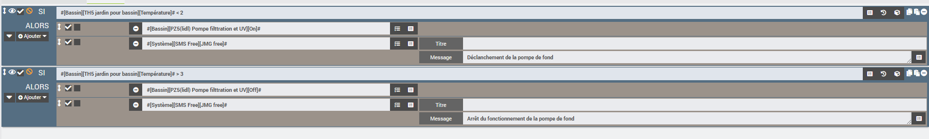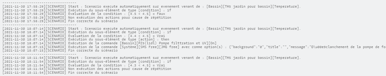 Première phase du scénario le déclenchement de la pompe lors de la baisse des températures. J’ai changé les valeurs de consigne pour avoir des logs exploitable de suite: