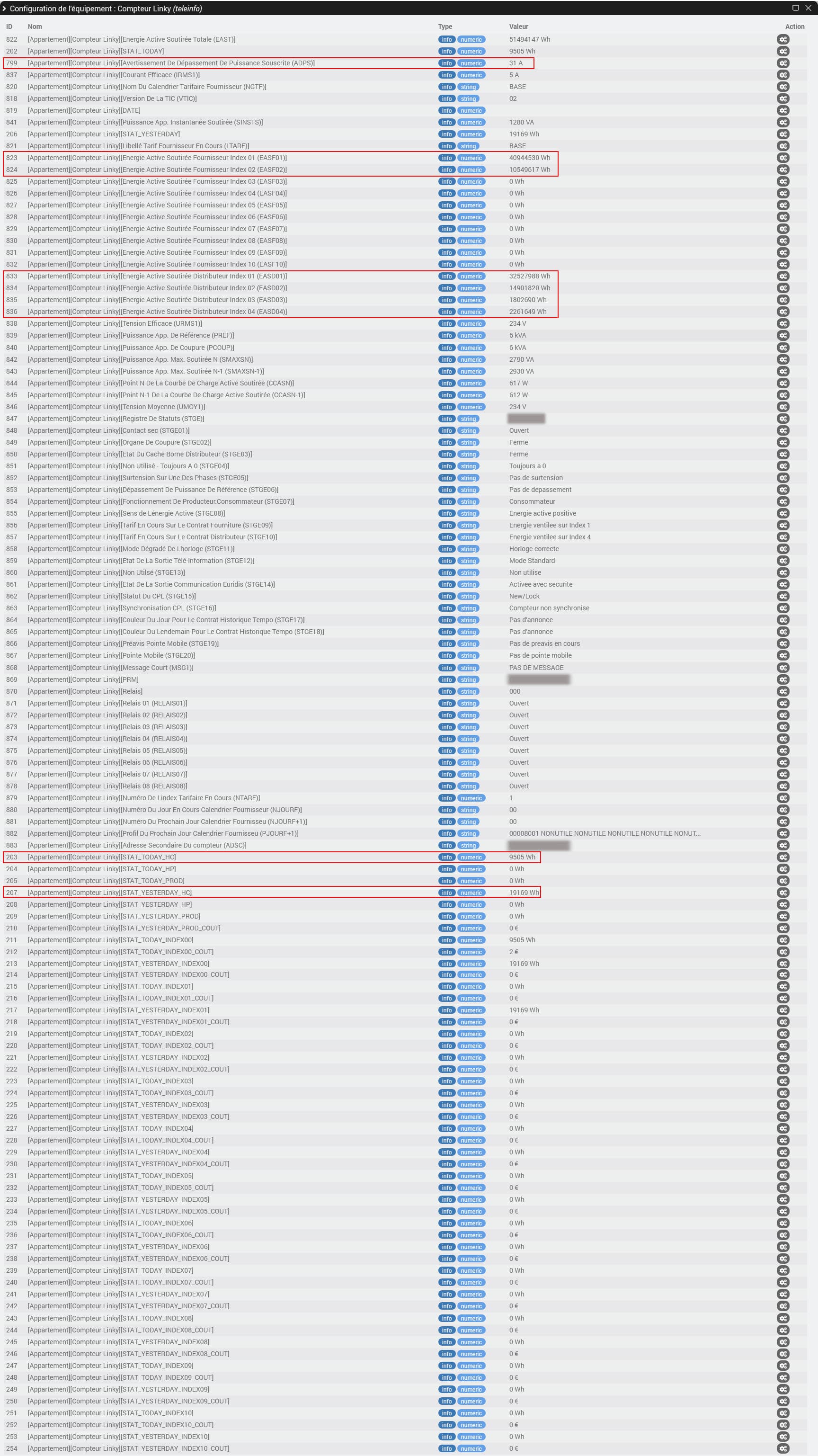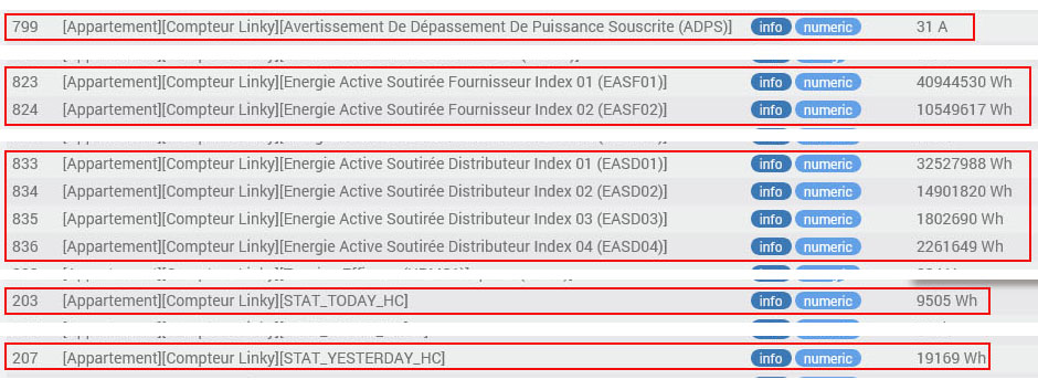 Bon alors il y a 2 sortes de commande dans un équipement téléinfo, celles créées sur réception d’une trame de la TIC et celles créées par le plugin. Celles créées par réception d’une trame tu vas les retrouver dans le doc d’Enedis, les autres sont soit des commandes inexistantes mais crées par la réception d’un trame erronée soit des commandes historiques (je ne suis pas le développeur initial de ce plugin) que j’ai laissées pour éviter de perturber les utilisateurs satisfaits du fonctionnement initial mais qui ne sont plus utiles si tu fonctionnes avec les nouveaux index (qui ne sont plus si nouveaux maintenant) soit des commandes utiles au plugin telles que je les aies construites avec les nouveaux index. Tes ID 203 et 207 font parties des commandes historiques et tu peux voir comment elles sont construites depuis les options accessibles depuis la page du plugin