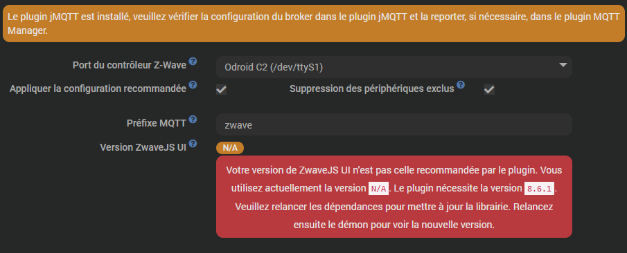 Bonjour à tous, j’essaie d’installer le plugin Z-Wave js mais l’installation des dépendances bloque à 7%. J’ai également ces deux messages d’erreur. Je ne vois pas ce que je dois vérifier dans la configuration du Broker dans le plugin MQTT Manger. Et le second message me dit que je n’ai pas la bonne version pour le ZwaveJS UI, version actuel N/A, version nécessaire 8.6.1.