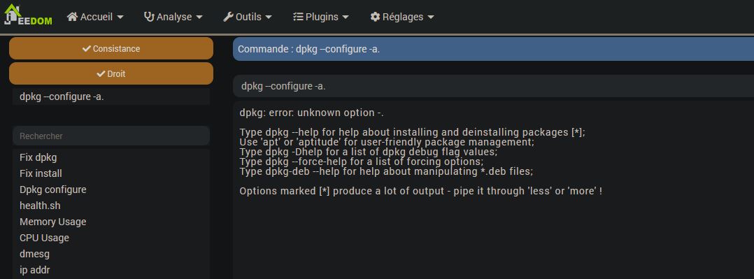 En ssh ou dans Administration -> OS/DB -> Système faire : dpkg --configure -a.