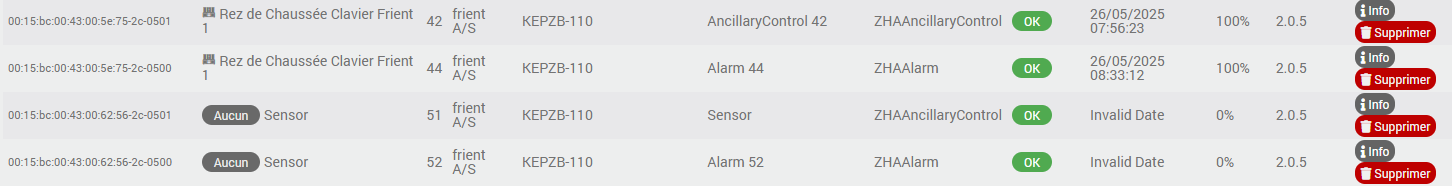 En fait c’est le problème : car même avant que je crée l’alarmsystem avec l’APIREST, le clavier 1 communiquait avec Jeedom( date de dernière communication ok et champ action valait ‘not ready’) alors que le clavier 2 est inclus , et il est ´vu’ par Jeedom mais il n’envoie de lui même rien à Jeedom. Dans Deconz et la page des noeuds, il y a INVALIDE dans la colonne Date de communication: depuis l’inclusion aucune info reçu du module meme la batterie est à zéro car aucune trame reçu avec l’info.