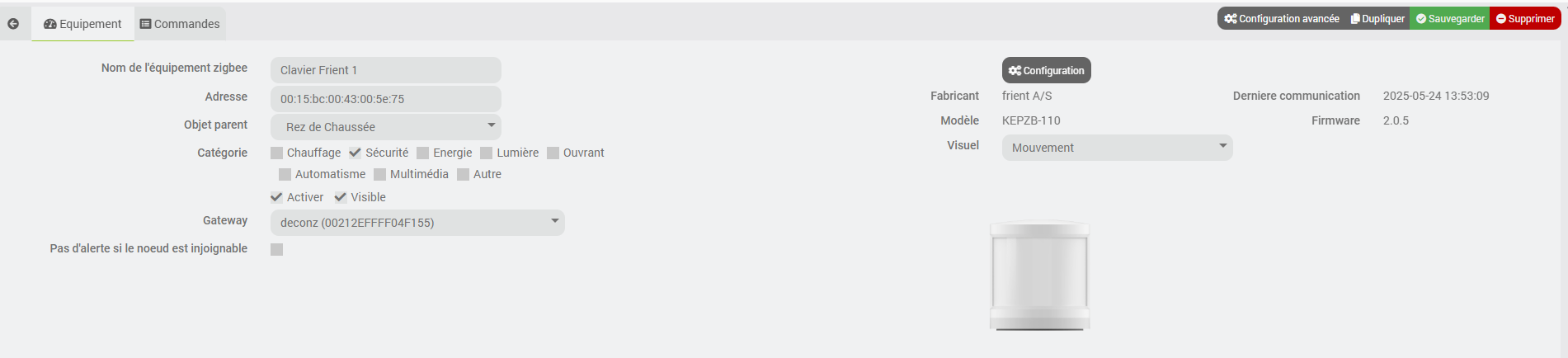 Avec mon Deconz mis a jour version 2.30.2, grace aux commandes HTTP, j’ai réussi a rendre fonctionnel un clavier. Merci ! Etonnamment j’ai un 2eme clavier qui s’inclut mais pourtant celui-ci n’est pas fonctionnel : il semble ne plus répondre a Deconz une fois l’inclusion faite (avant de tenter un armemement ou désarmement, quand j’appuie sur les boutons, aucun signe de vie, et j’ai réinclus plusieurs fois) Je me demande si vouloir utiliser 2 claviers n’est pas problematique ? qu’en pensez vous @Idaho947 @franck67 @HugoVal11 ?