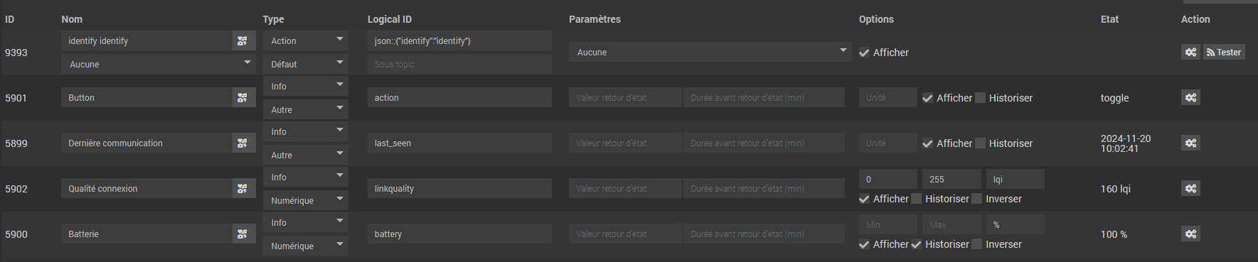 Bon, ce n’est pas gênant pour moi car je n’utilise pas ces commandes (ON, OFF, variation de luminosité, variation de couleur,…) en tant que telles dans Jeedom (je ne remonte que l’info concernant la charge de la batterie). En effet, je les associe toutes (via le binding) avec les luminaires qu’elles commandent directement.