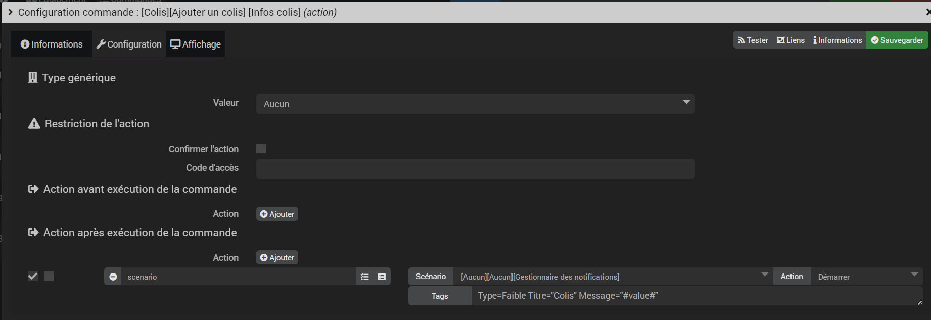 Comment faire pour intégrer la valeur de la commande dans la fonction « Action après exécution de la commande » ?