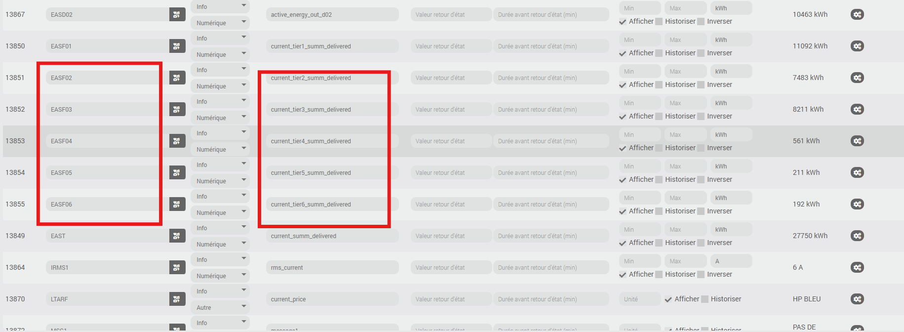 [2025-07-07 17:16:39] DEBUG : MQTT------Data : {"active_energy_out_d01":11834,"active_energy_out_d02":10464,"active_power":46,"active_power_max":5757,"active_power_ph_b":276,"apparent_power":914,"available_power":6,"average_rms_voltage_meas_period":224,"current_date":"E250707170541","current_index_tarif":2,"current_price":"HP BLEU","current_summ_delivered":27751,"current_summ_received":0,"current_tarif":"TEMPO","current_tier1_summ_delivered":11092,"current_tier2_summ_delivered":7484,"current_tier3_summ_delivered":8211,"current_tier4_summ_delivered":561,"current_tier5_summ_delivered":211,"current_tier6_summ_delivered":192,"device":{"applicationVersion":12,"dateCode":"20230214","friendlyName":"Allée - Zlinky","hardwareVersion":1,"ieeeAddr":"0x00158d0005d297a9","manufacturerID":4151,"manufacturerName":"LiXee","model":"ZLinky_TIC","networkAddress":9982,"powerSource":"Mains (single phase)","softwareBuildID":"4000-0013","stackVersion":2,"type":"Router","zclVersion":3},"drawn_v_a_max_n1":4938,"injected_active_load_n":0,"injected_active_load_n1":0,"injected_v_a":0,"injected_v_a_max_n":0,"injected_v_a_max_n1":0,"last_seen":"2025-07-07T17:16:39+02:00","linkquality":108,"message1":"PAS DE MESSAGE","message2":"","meter_serial_number":"061864279960","power_threshold":6,"reactive_power":0,"reactive_power_ph_b":0,"reactive_power_ph_c":0,"relais":108,"relais_breakout":{"relais1":0,"relais2":0,"relais3":1,"relais4":1,"relais5":0,"relais6":1,"relais7":1,"relais8":0},"rms_current":3,"rms_voltage":229,"site_id":"19366280726392","software_revision":2,"status_register":"013A4401","status_register_breakout":{"cache_borne_dist":"ferme","comm_euridis":"activee avec securite","contact_sec":"ouvert","depassement_ref_pow":0,"etat_cpl":"nouveau_verrouille","horloge":"correcte","organe_coupure":"ferme","pointe_mobile":"AUCUN","preavis_pointe_mobile":"AUCUN","producteur":0,"sens_energie_active":"positive","surtension_phase":0,"sync_cpl":"non_synchronise","tarif_dist":"index_2","tarif_four":"index_2","tempo_demain":"UNDEF","tempo_jour":"BLEU","type_tic":"standard"},"total_reactive_power":0,"update":{"installed_version":1,"latest_version":16,"state":"available"}}