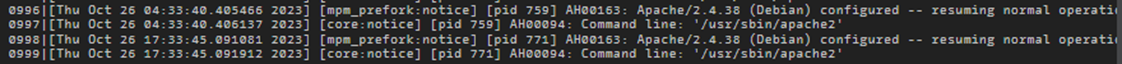 Apres redémarrage, /var/log/apache2/error.log : vide
