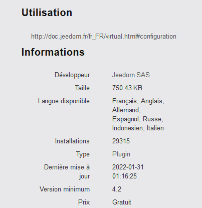 La dernière version de Virtuel indique qu’il faut avoir la v4.2 pour l’utiliser. Dont acte. Ça fait partie des choses bizarres qu’un plug in soit déclaré non compatible mais que le gestionnaire de mise à jour Jedom permette quand même son installation en 4.1