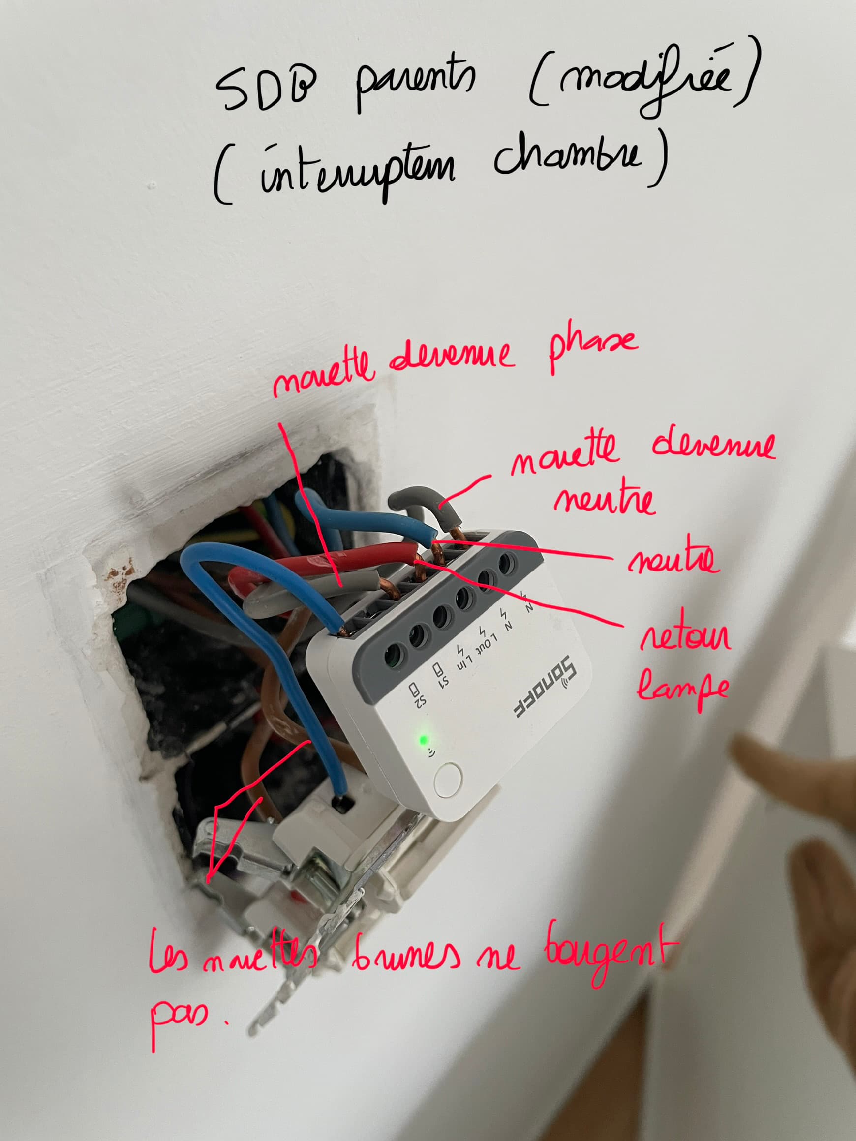 Dans l’interrupteur de la chambre, qui est celui connecté à la lampe, j’ai connecté comme suit :
