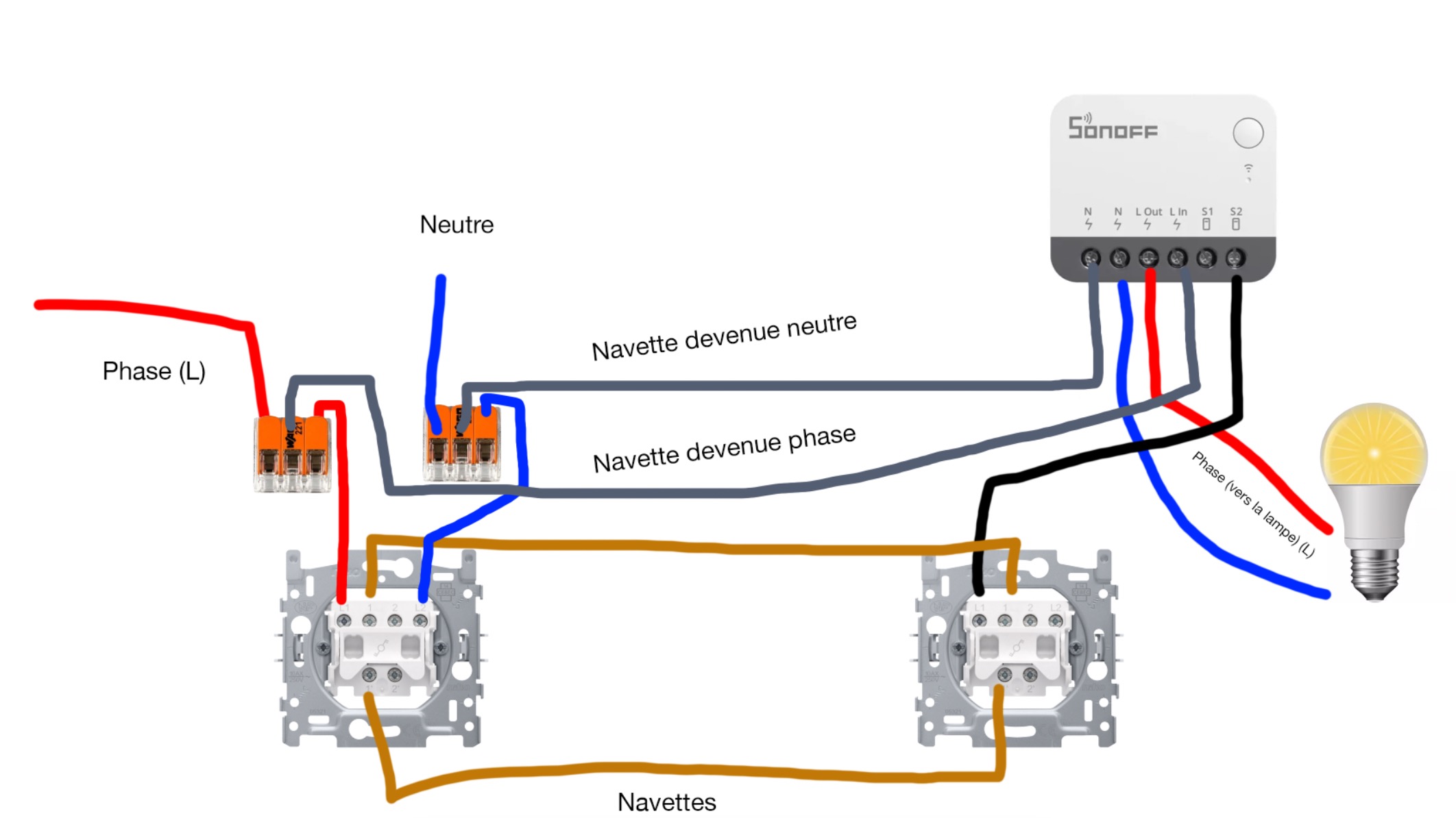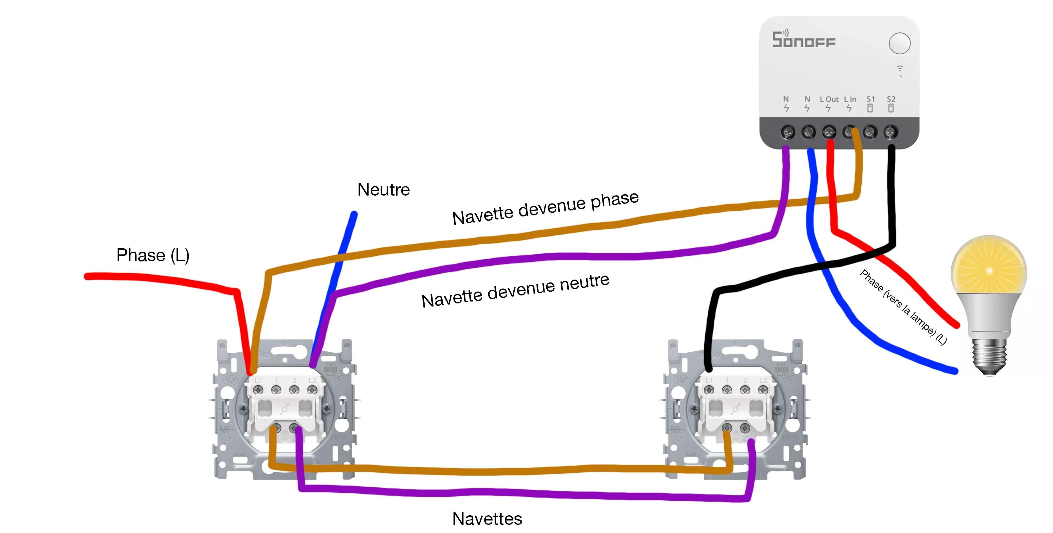 Je te reviens tantôt avec un beau dessin (avec le module Sonoff sur le circuit) pour voir si ça te semble correct.