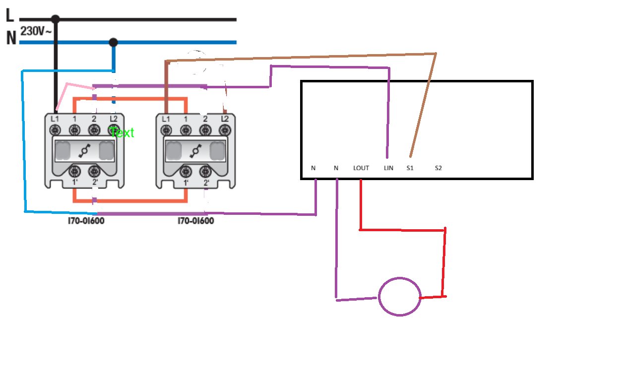 Pour le neutre, j’ai besoin de N in et N out. Si je branche la navette mauve (du haut) sur le neutre pour l’amener dans l’interrupteur de droite, est-ce que là je peux « dédoubler » le câble pour avoir du N in et N out ? Ou c’est un hérésie / dangereux ?