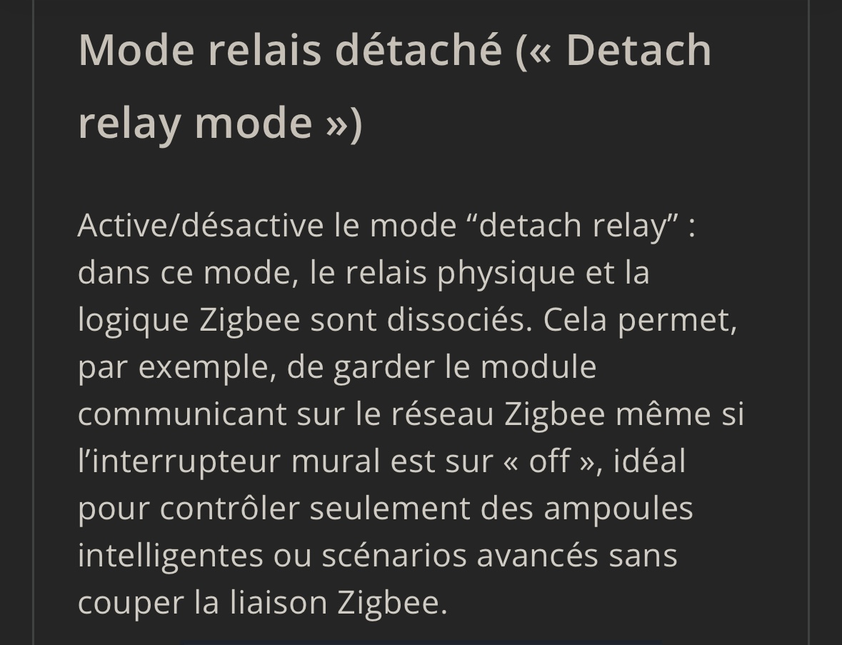 Avec ce mode : on aurait toujours les 2 actions (on / off) mais DEUX informations (état du relais ET état de l’interrupteur). Ces deux informations étant maintenant des informations indépendantes. Une étant piloter seulement par l’interrupteur, l’autre seulement par l’état du relais lui meme exclusivement piloter par les commandes de type action.