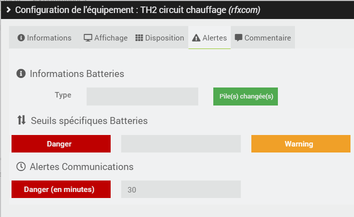 Merci. Dans ce cas comment je dois faire pour relier l’alerte communication si le temps est supérieur à 30 minutes avec un messge du type « th2 ne communique plus avec Jeedom »