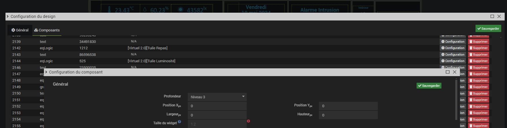 Mais je viens de me rendre compte également que Jeedom (?) réinitialise à 0 certaines valeurs de tuiles : position x et y, hauteur et largeur :