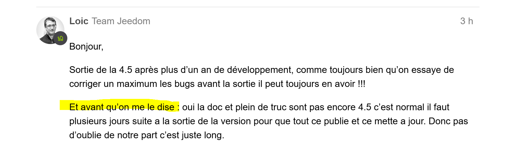 Pas de souci. juste ma réponse parcequ’on me dit d’aller voir une url connue de personne en tant qu’utilisateur. C’est corrigé puisque tout le monde saura maintenant ou aller voir le changelog… s’ils vont sur le forum. Bonne continuation et merci pour toutes ces améliorations. D’expérience j’attendrai 1 mois de retours d’utilisateurs sur le forum avec mes 316 équipements, 3537 commandes et 31 plugins qui me servent chaque jour et dont je doute de la compatibilité.
