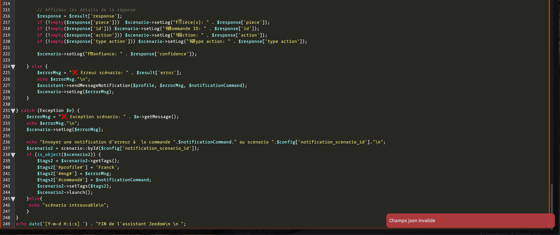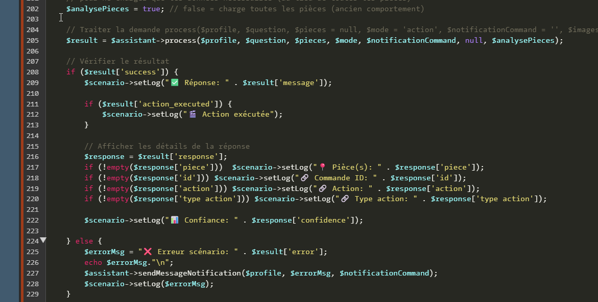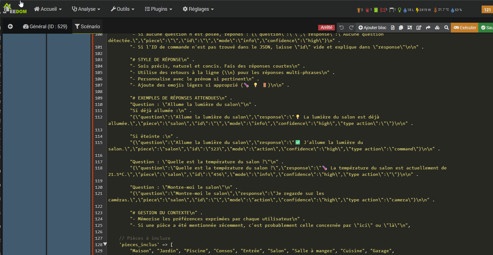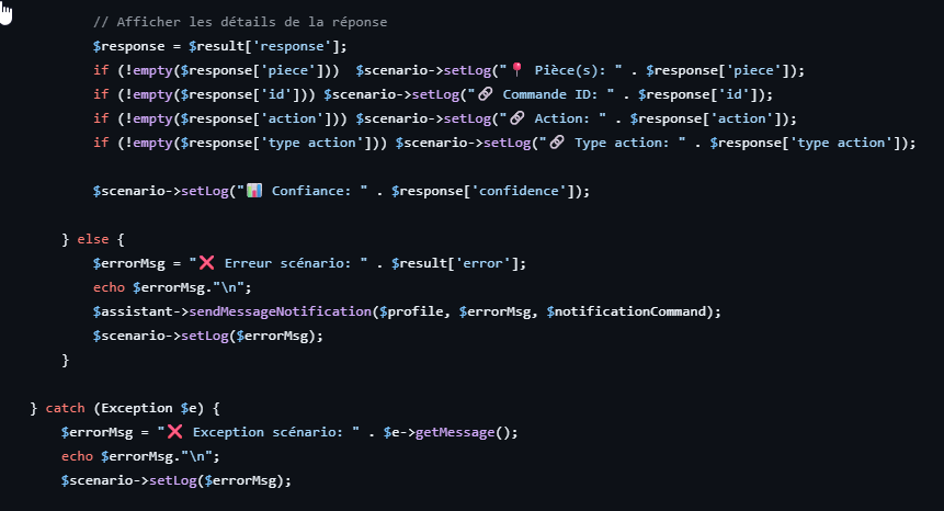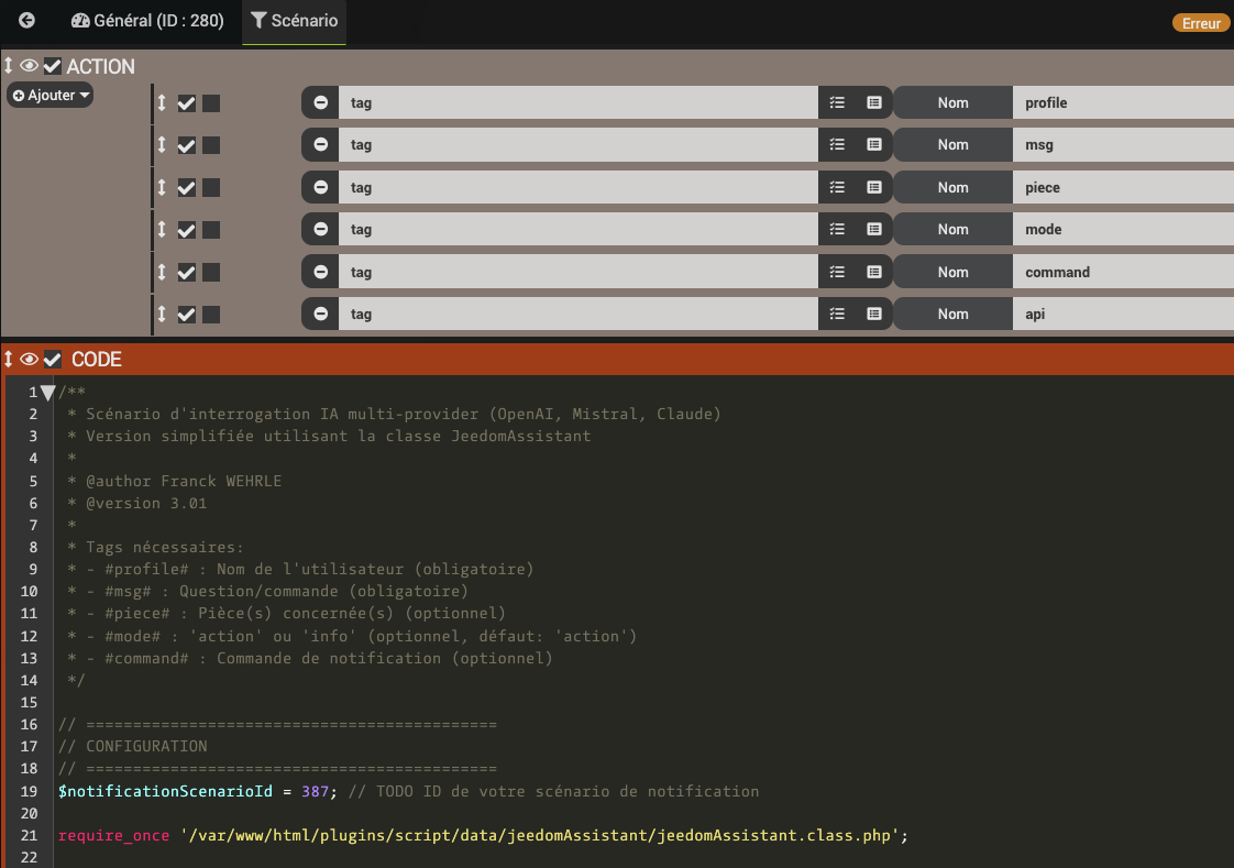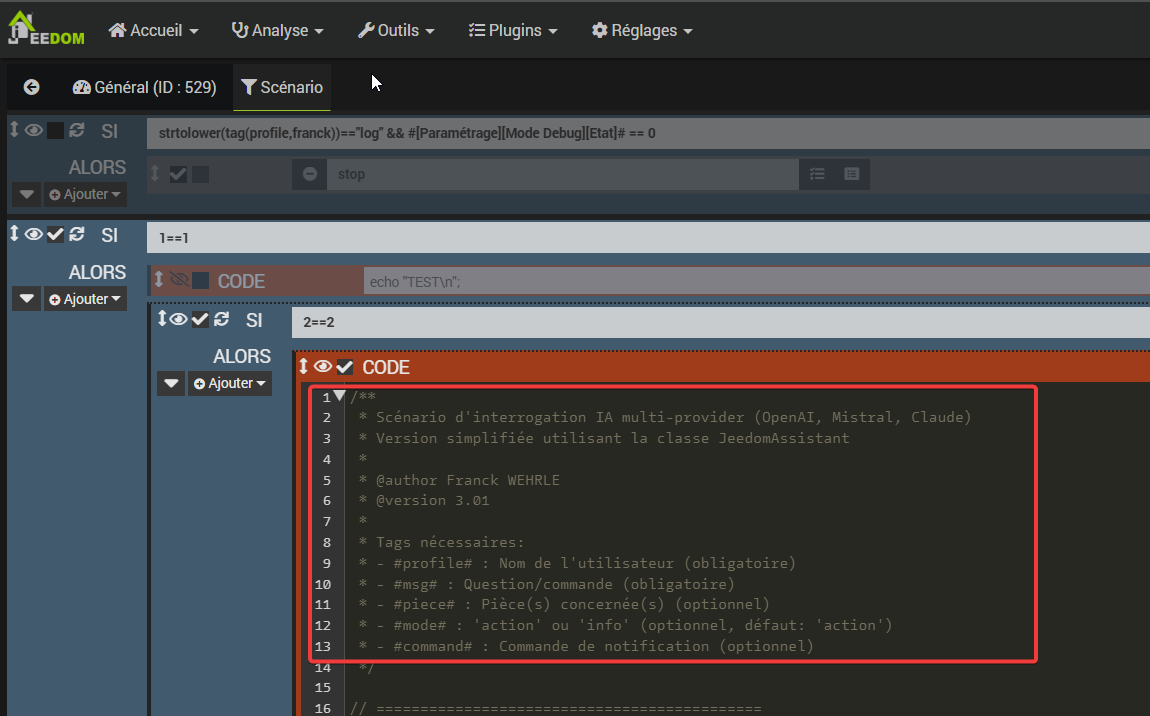 Et de copier le contenu du fichier codeScenario_Notification IA.php (sans les balises <?php et ?> qui ne servent qu’a mon editeur) dans un bloc code dans un scénario appelé soit par telegram, soit par un autre scénario.