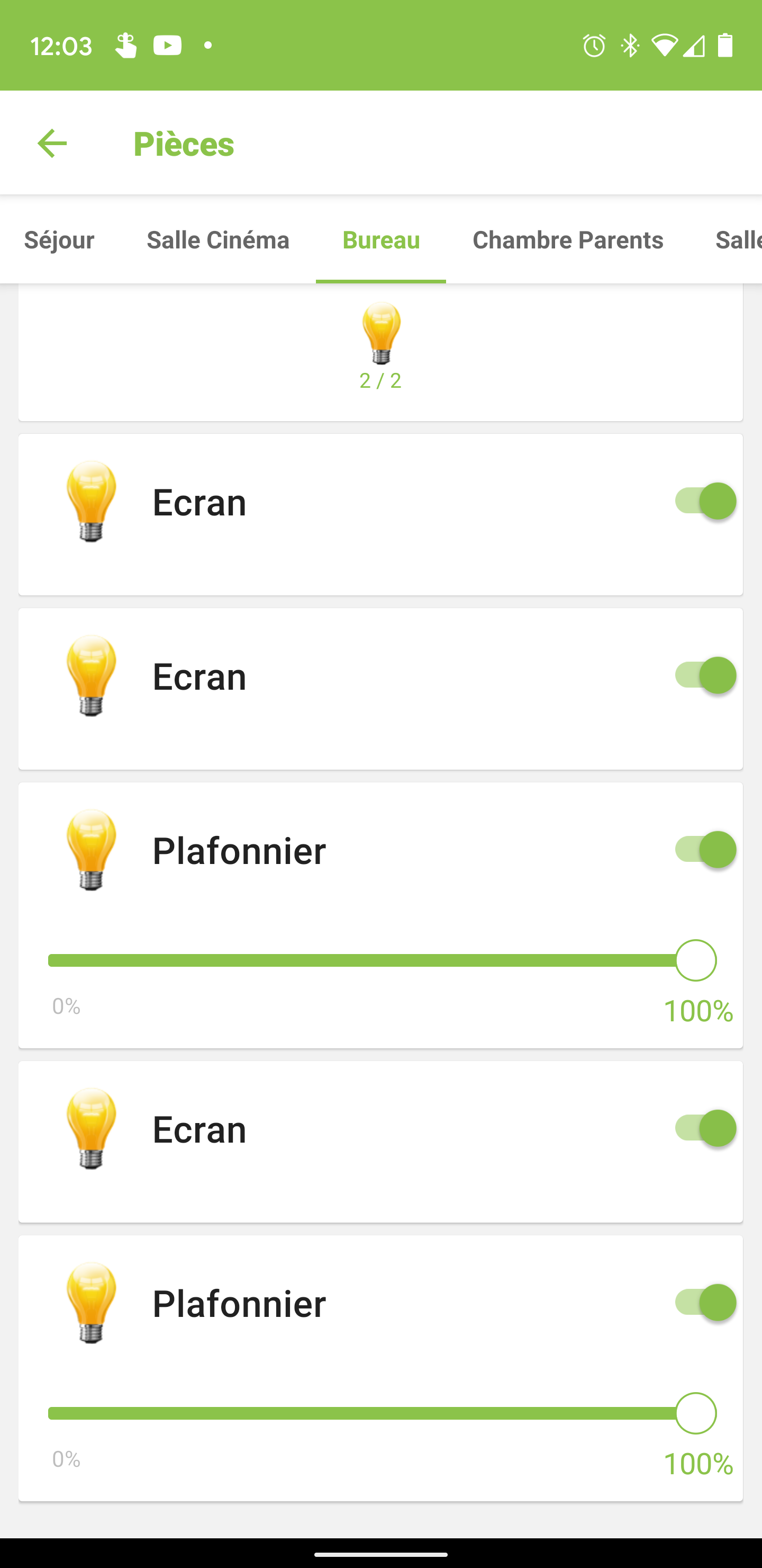 Et dans le menu déroulant, apparaissent du coup un widget lumière rattaché à la pièce + un autre rattaché au groupe que j’avais créé dans le menu…