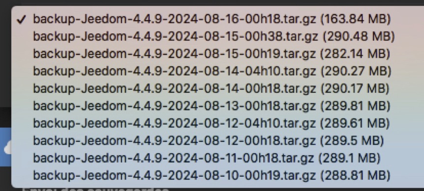Après une mise à jour du core le 15/08/2024 mon jeedom semblait avoir une interface cassée : plus de menu, juste des textes flotants… Bref j’ai lancé une restauration de mon backup et là :