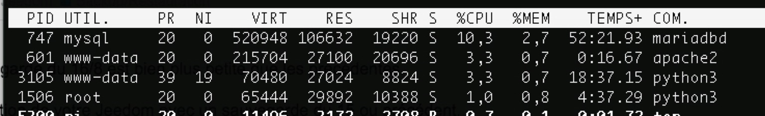Je vois en faisant un 'top" que j’ai mariadbd qui tourne encore activement (8-11% de CPU) plusieurs heures après le lancement de la restauration. Est ce qu’il se pourrait que la base sql soit toujours en reconstruction ?