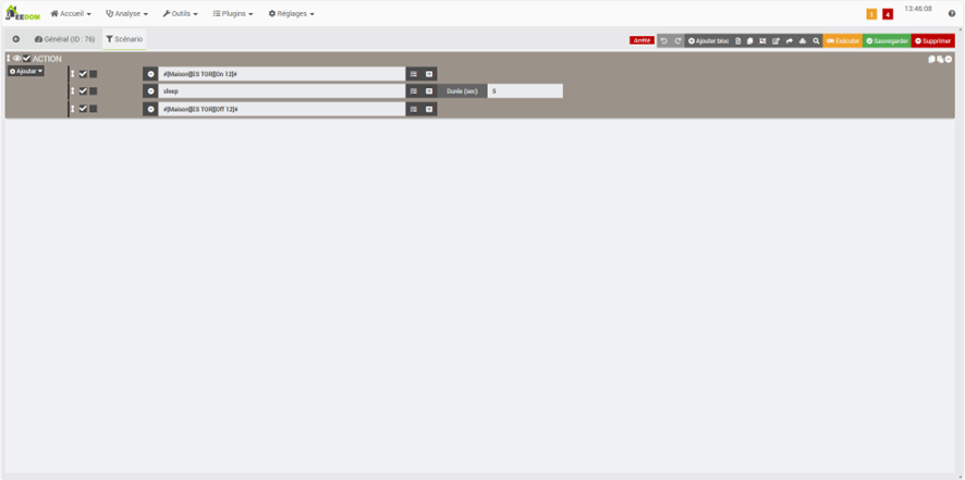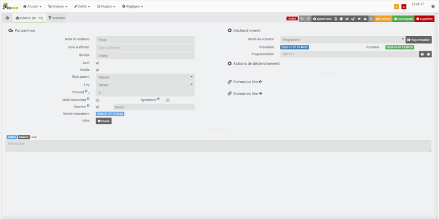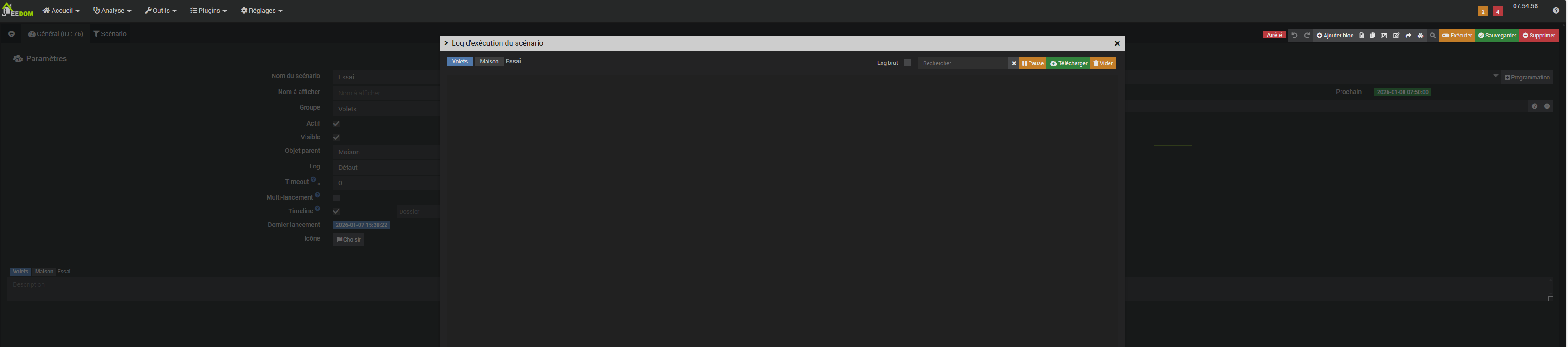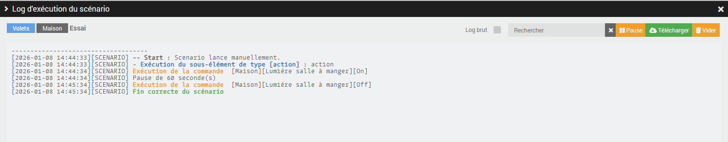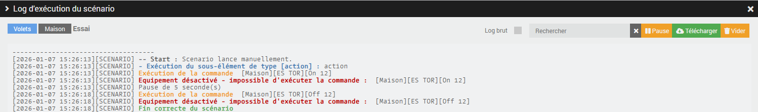 Rien ne change, le scénario ne se lance toujours pas toutes les 5 minutes et je n’ai toujours rien dans le log du scénario. Ca me donne l’impression que le scénario ne se déclenche pas.