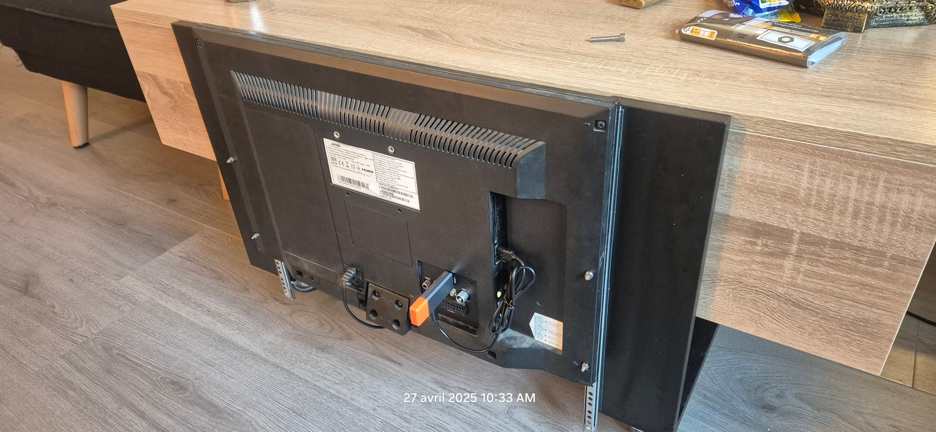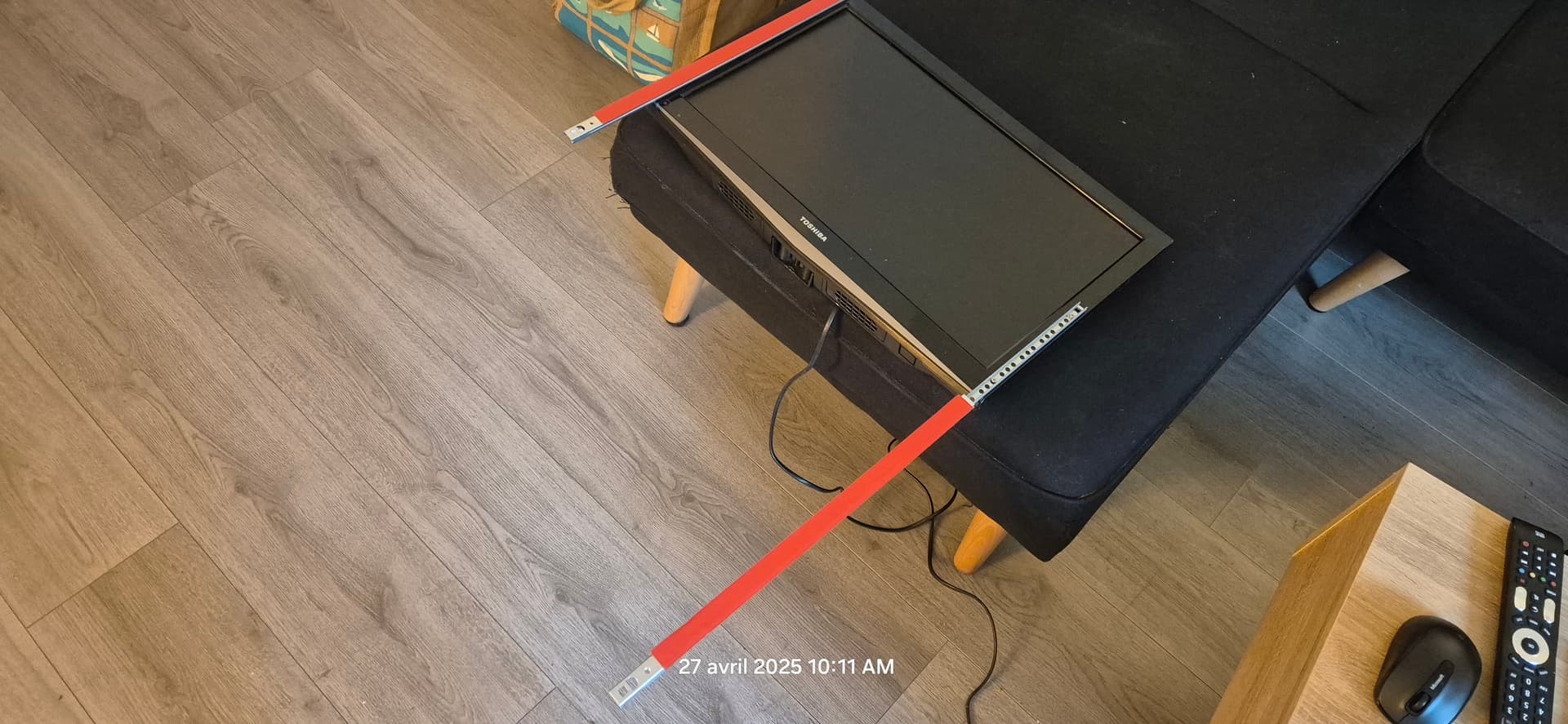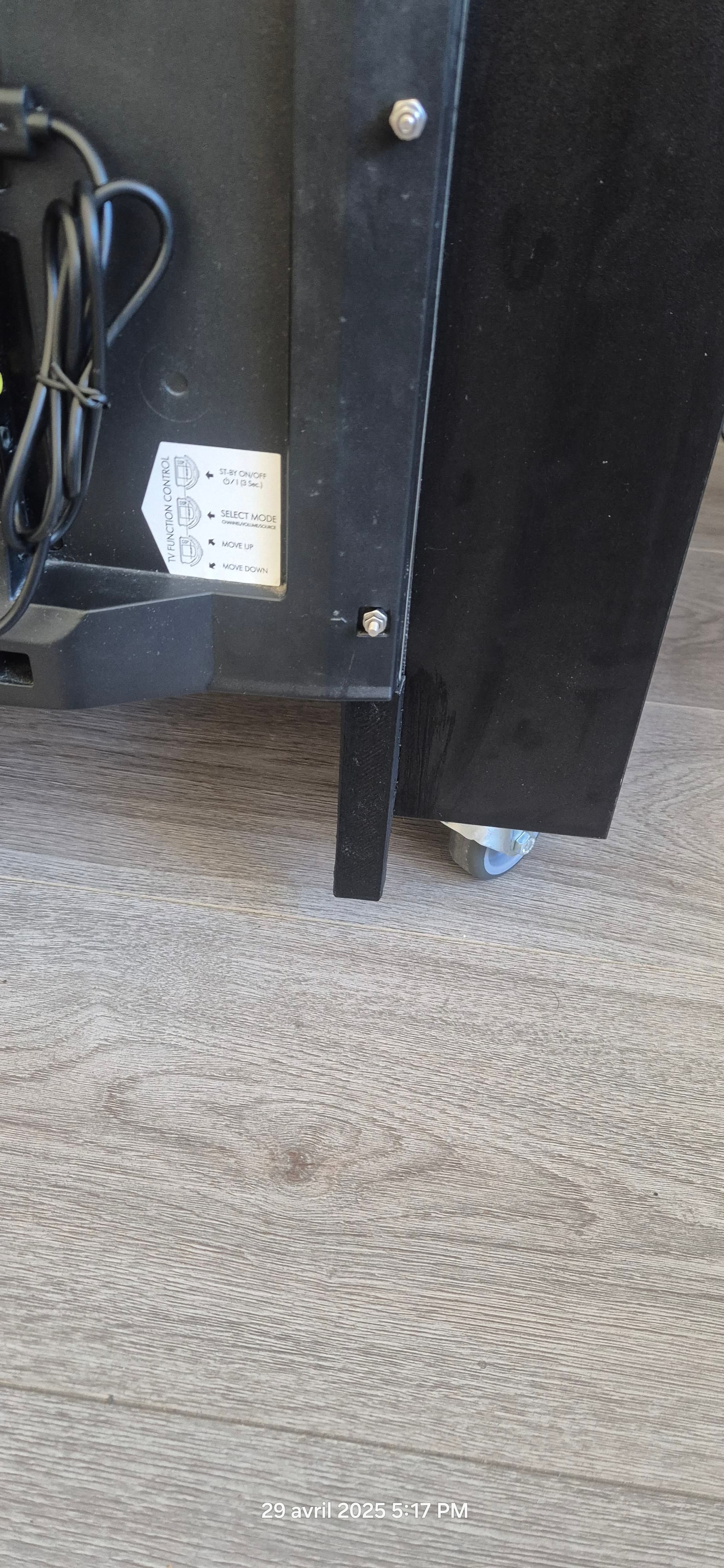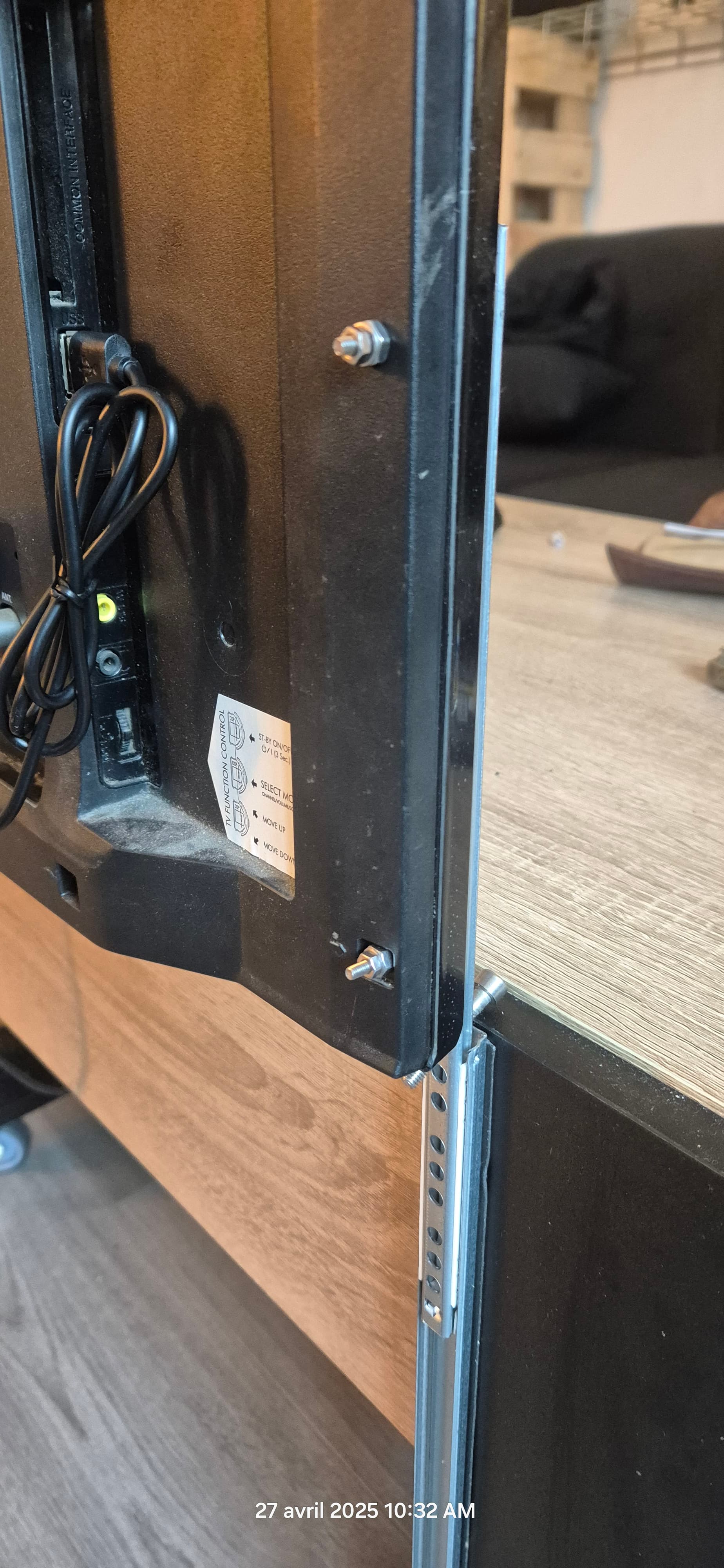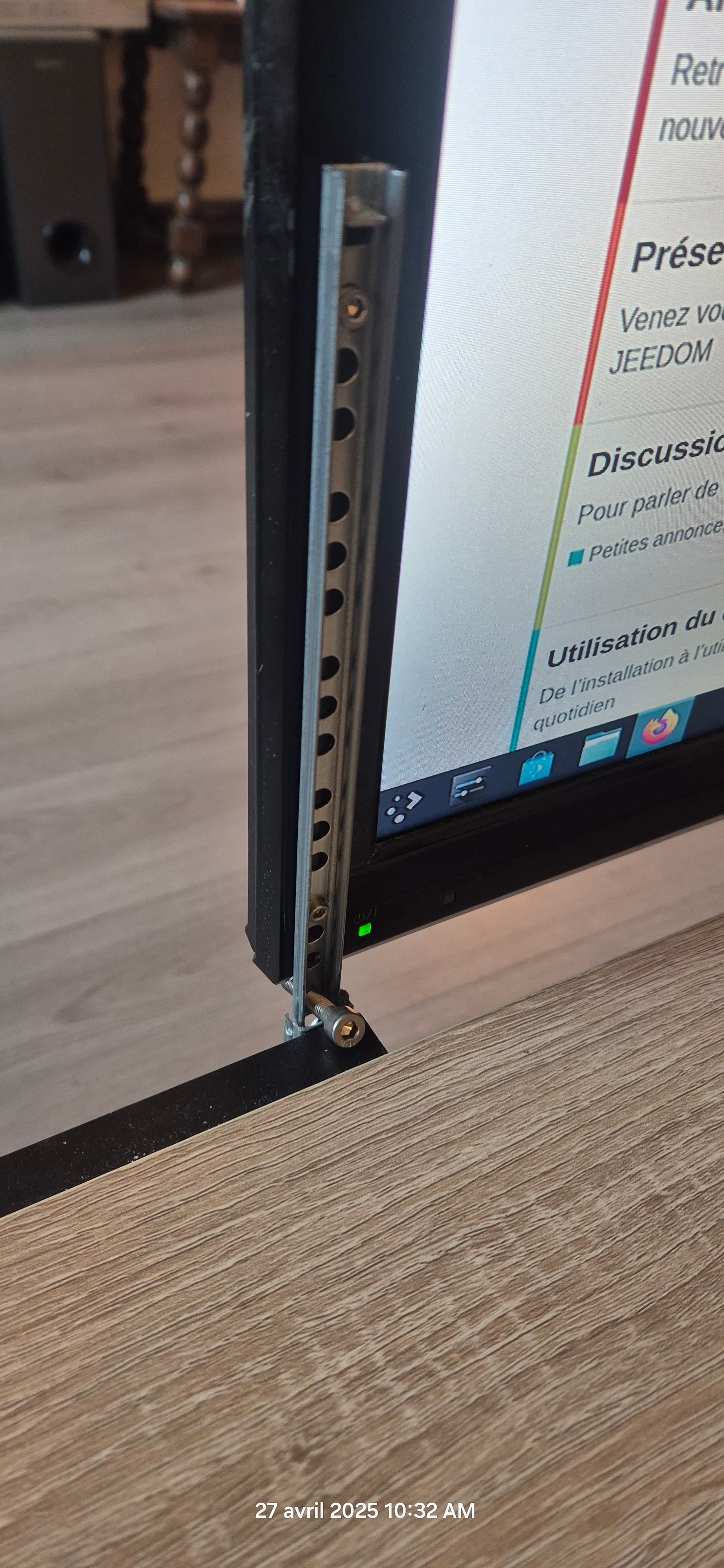 J’ai pas préciser plus haut mais j’ai opter pour un collage au double face 3M des glissières sur la table basse pour éviter d’y faire des trous qui pourrais se retrouver visibles en cas de changement d’écran.